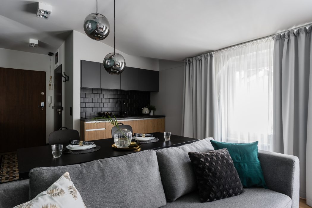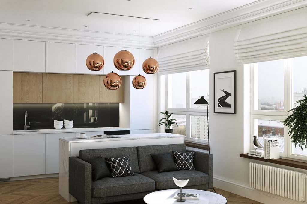 Al separar la cocina de la sala de estar en el estudio, el bar, la mesa del comedor o la partición deslizante desempeñarán perfectamente el papel del delimitador.