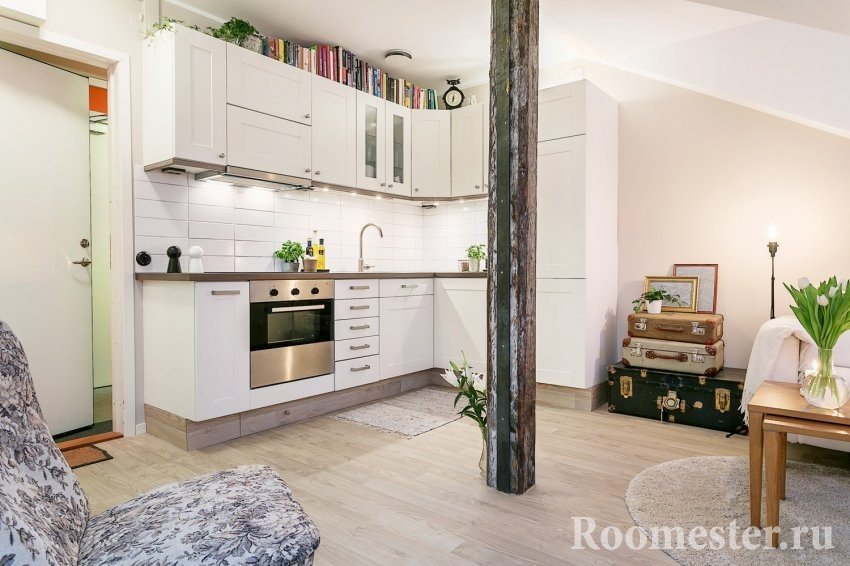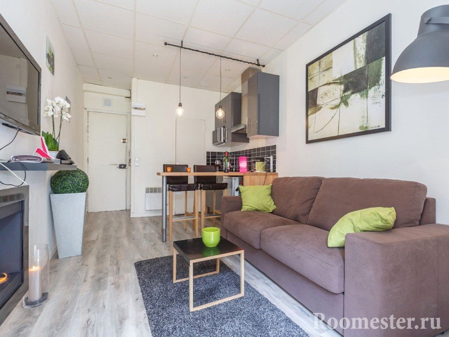 Los materiales modernos permitirán fácilmente un enfoque razonable de la unidad del piso. Esto agregará libertad visual al estudio. La imitación de madera clara sobre gres porcelánico proporcionará practicidad en las áreas necesarias y la decoración laminada de la parte principal y residencial - presupuesto. Los pisos cálidos en áreas estratégicas (pasillo, cocina, baño) no serán superfluos.