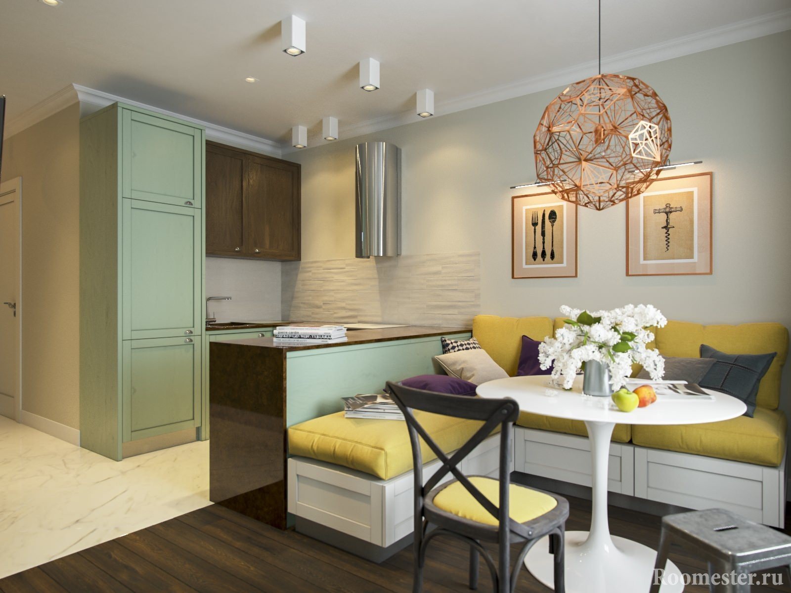 Esto no significa que el apartamento se vuelva monótono, carente de acentos brillantes y ricos: turquesa, lavanda, baya, limón. Pero solo bajo la condición de una distribución uniforme en toda el área del color favorito preferido.