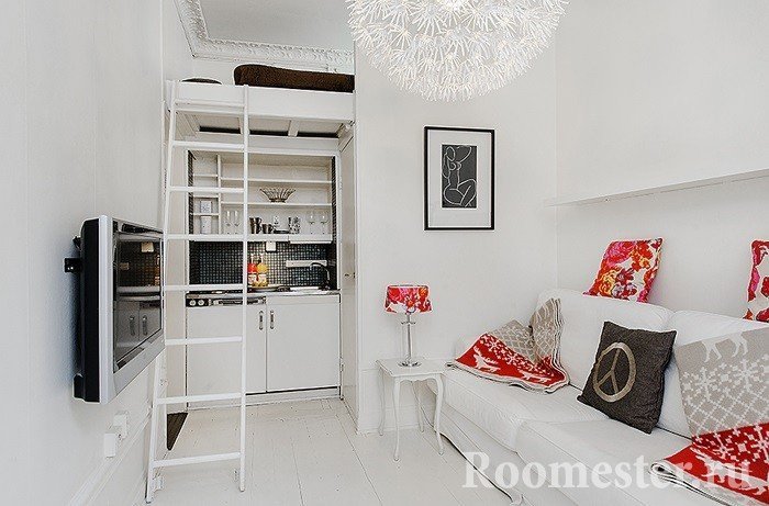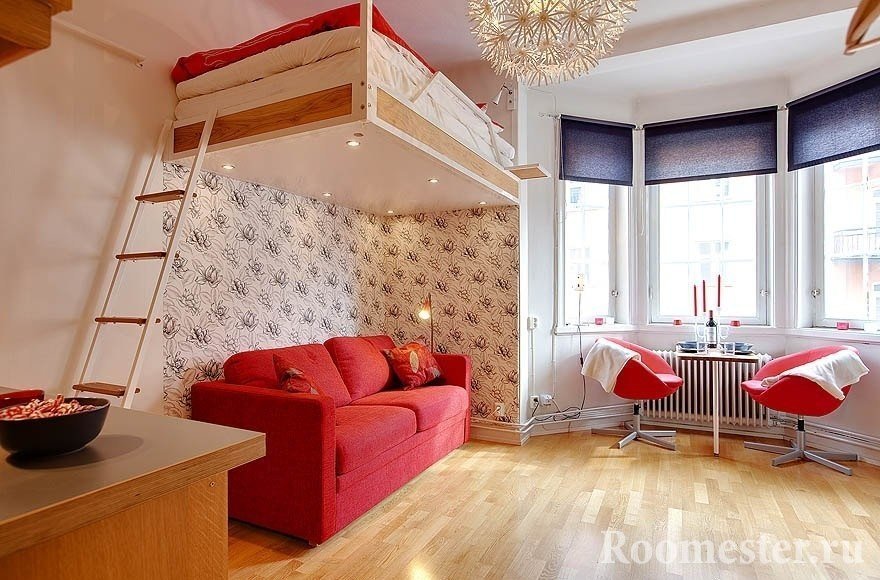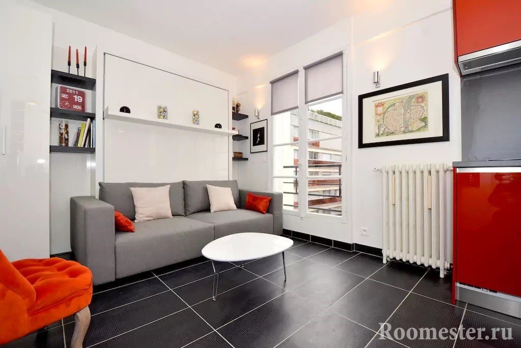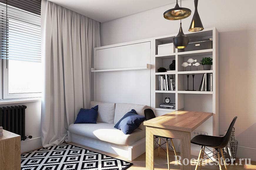 Si las ideas con una pasarela no encajan: una cama que se pliega y se convierte en un armario durante el día es una forma alternativa de tener una cama llena en la sala de estar. El alféizar de la ventana se usa activamente como una mesa o un área de descanso suave.