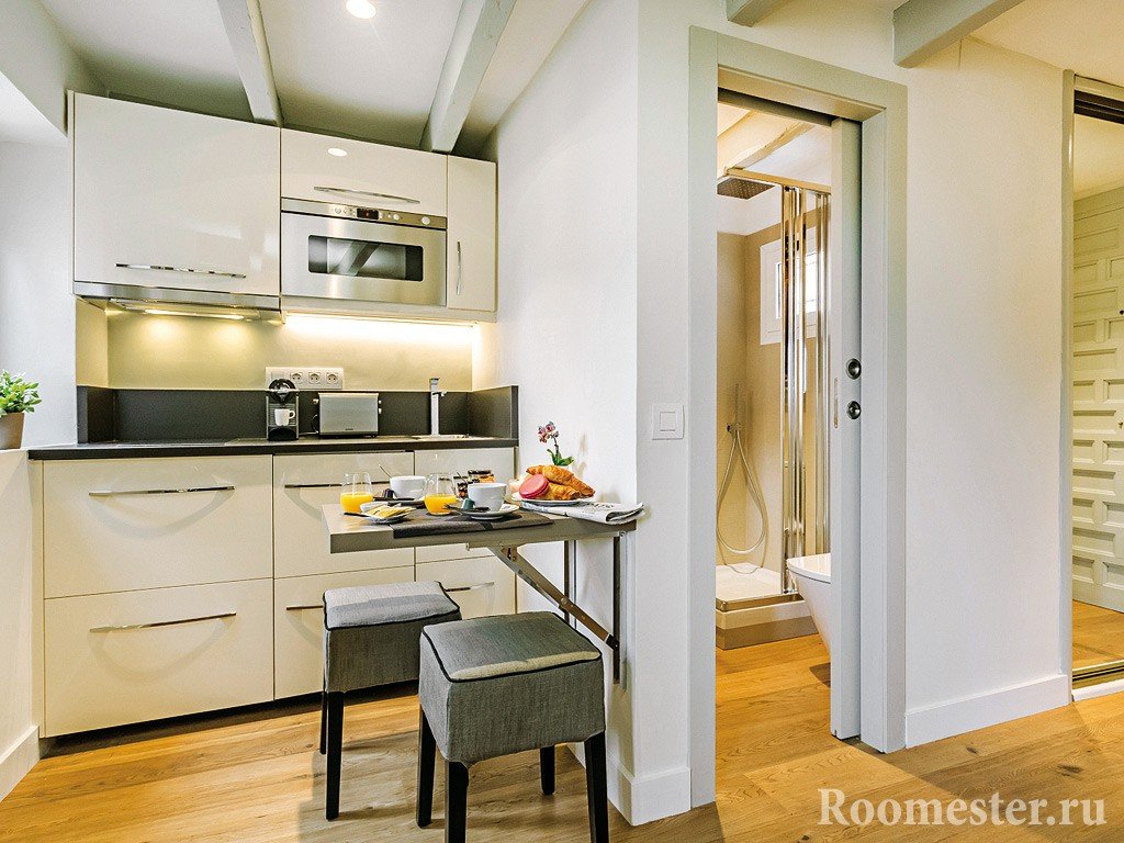 Antes de planificar el diseño de un pequeño estudio, debe decidir las prioridades, cortar el exceso. Si la cocina con el comedor o el dormitorio con la sala de estar se pueden combinar debido a los muebles funcionales, entonces con otras áreas, tal multitarea no es factible: