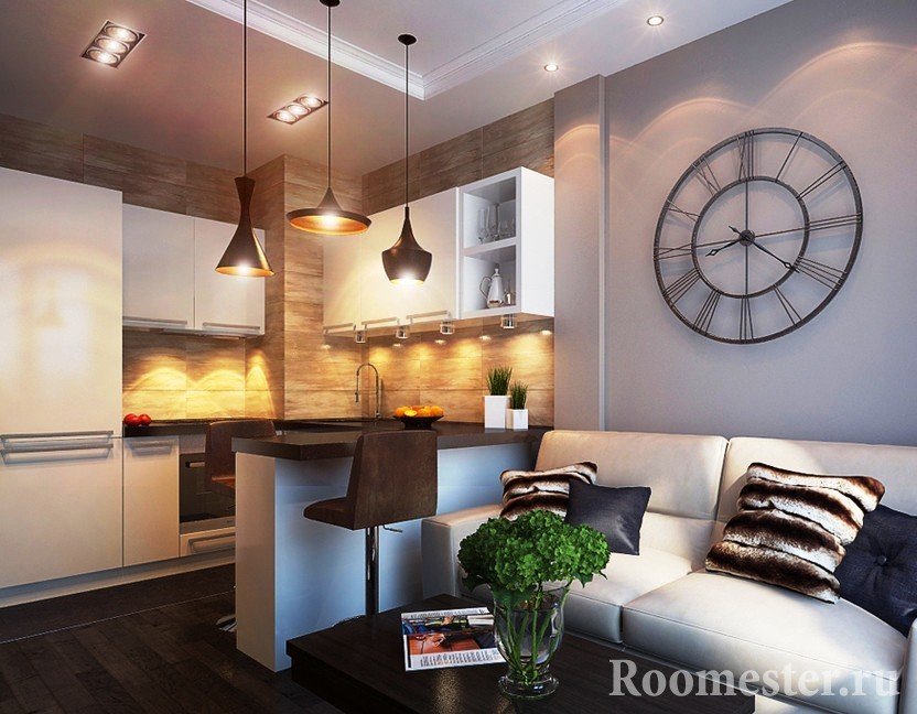 Si los techos son bajos, es aconsejable abandonar la apariencia habitual de los candelabros, especialmente sobre los lugares libres de los pasillos. Los accesorios de moda jugarán junto con la zonificación, y diferentes escenarios de iluminación crearán la atmósfera necesaria, convirtiendo la sala de estar en un dormitorio.