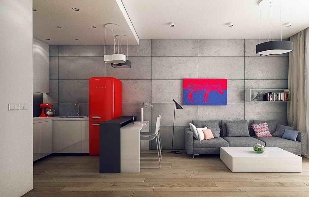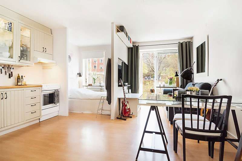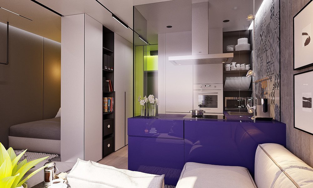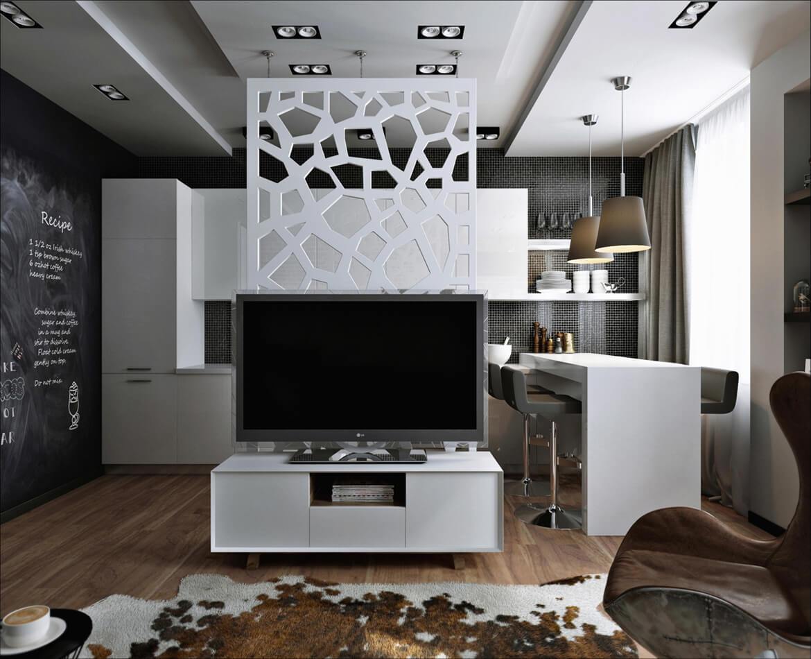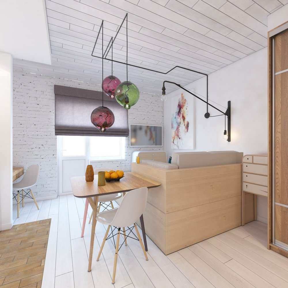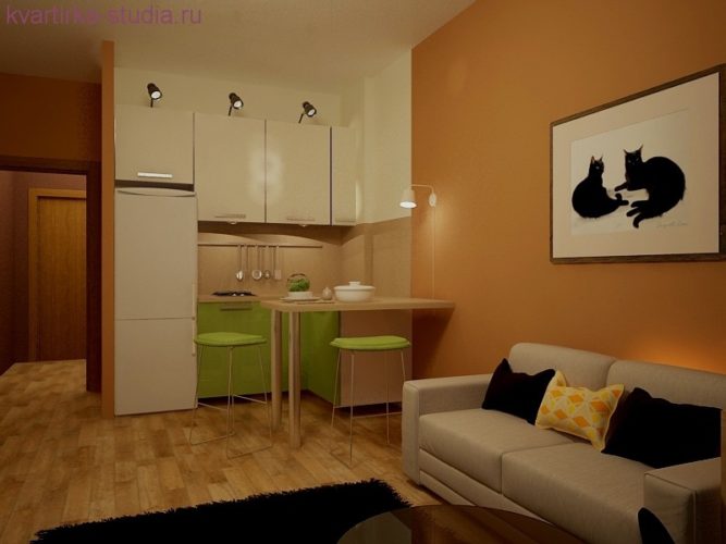 Un moderno estudio es una solución económica para una pareja casada. Las instalaciones económicas le permiten realizar el sueño de su propia vivienda. En este caso, la ausencia de paredes y divisores expande el espacio y lo libera.