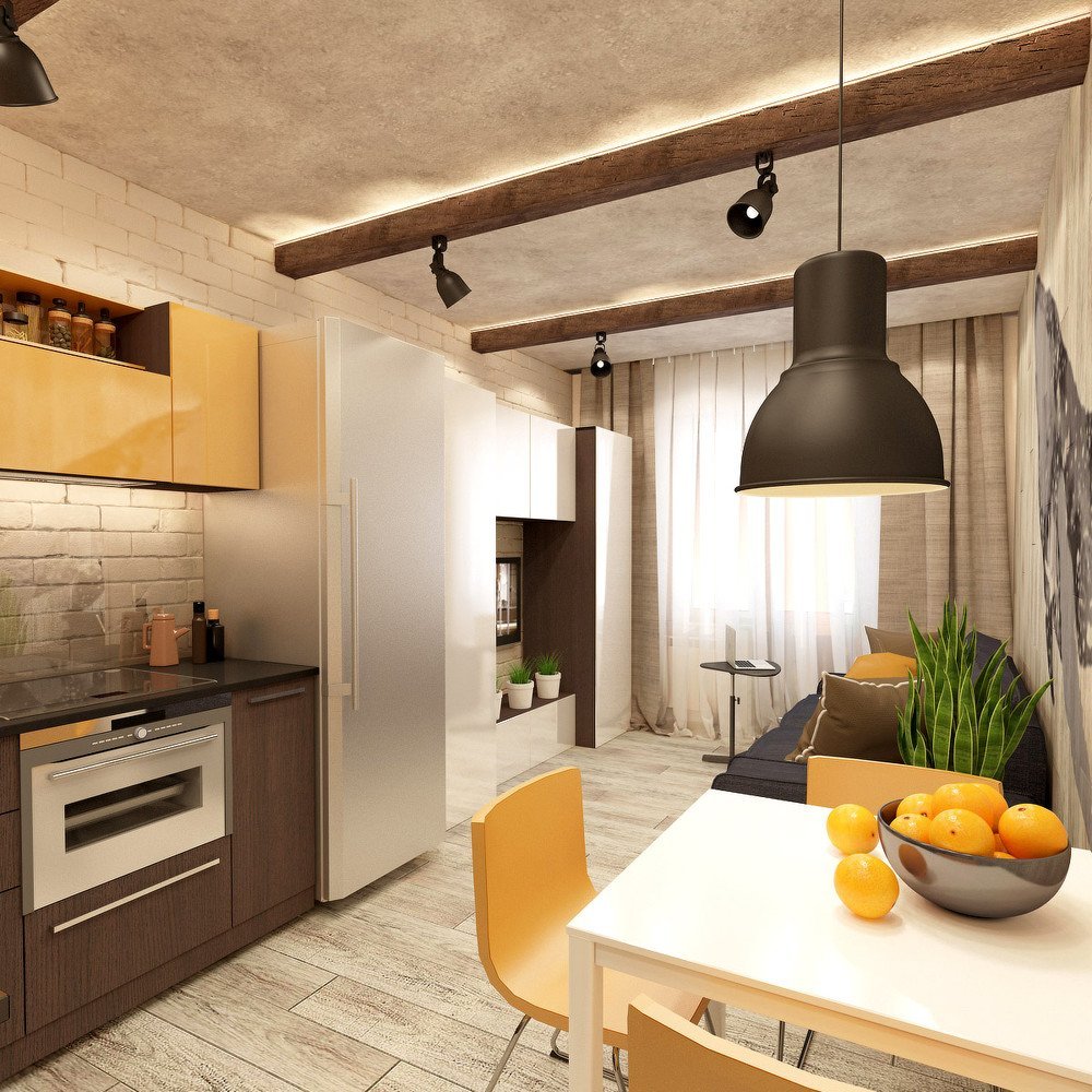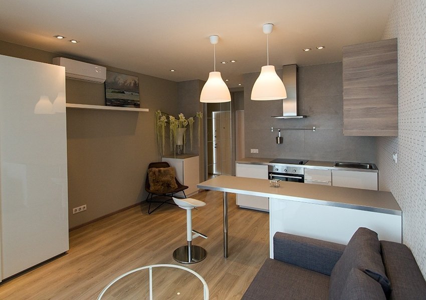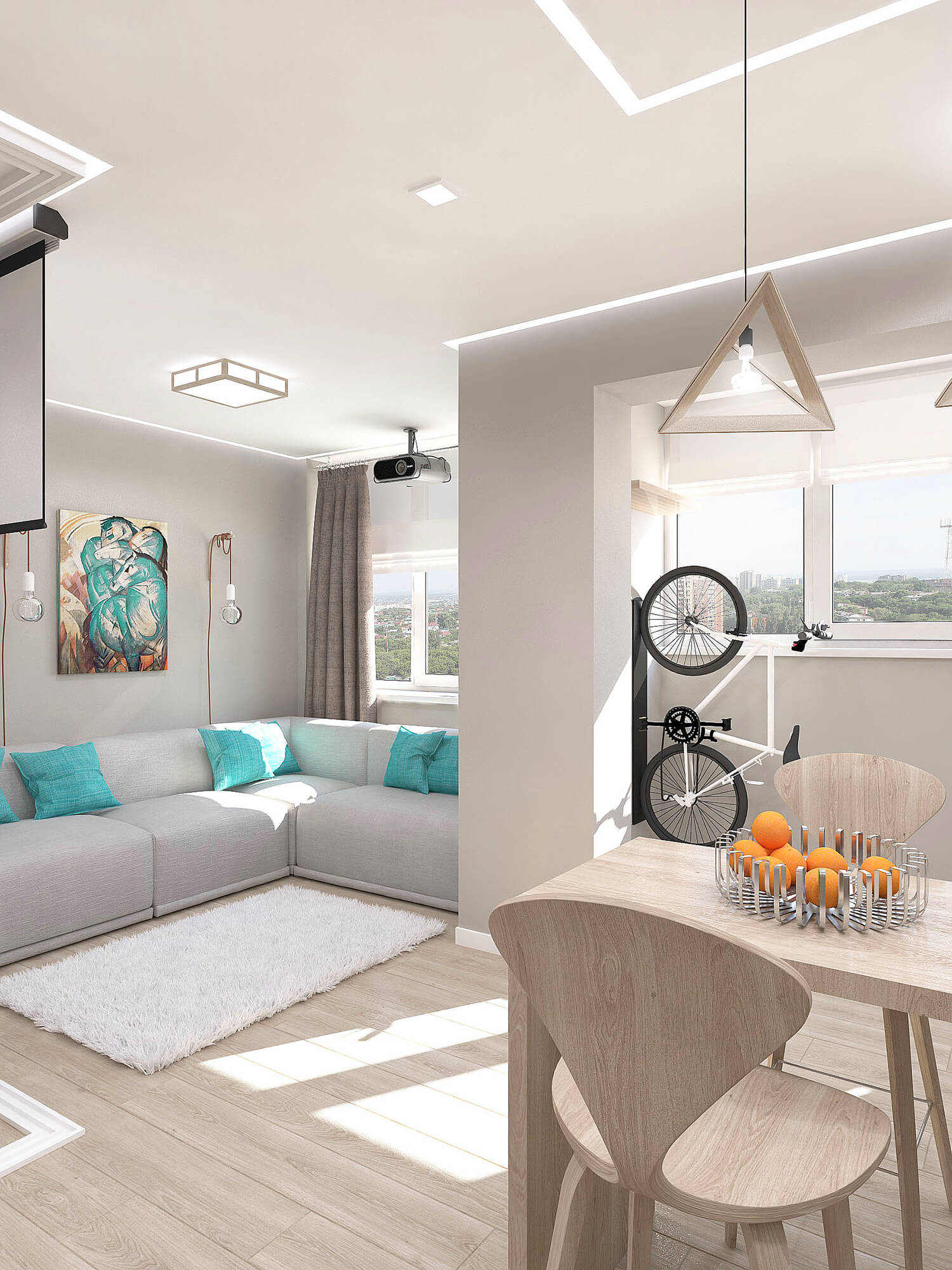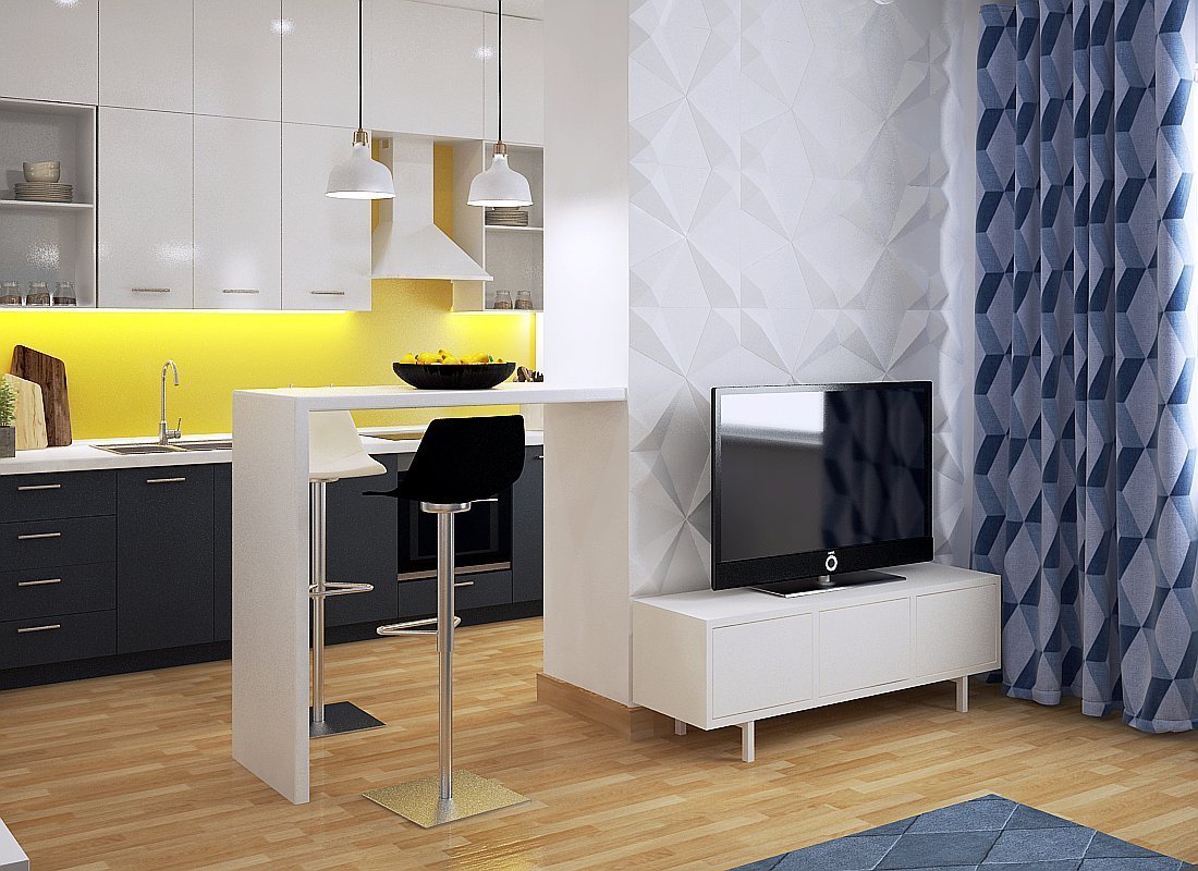 Un moderno estudio es una solución económica para una pareja casada. Las instalaciones económicas le permiten realizar el sueño de su propia vivienda. En este caso, la ausencia de paredes y divisores expande el espacio y lo libera.