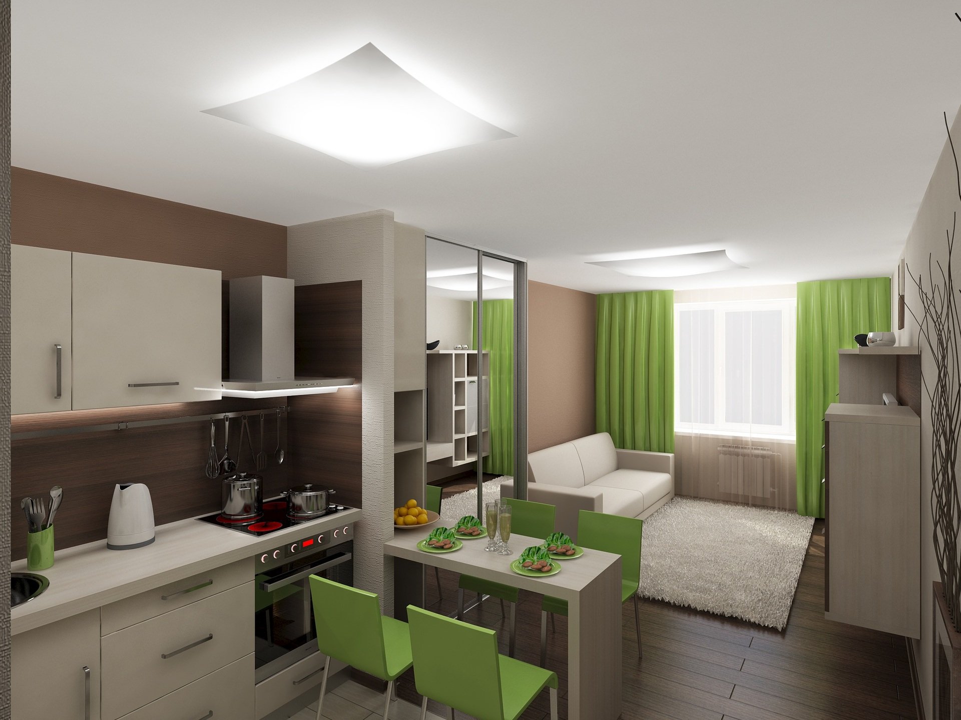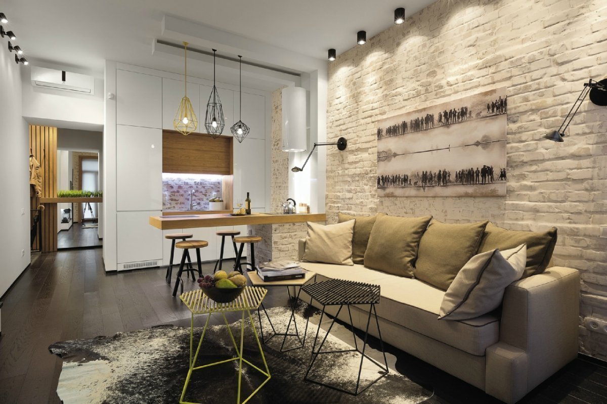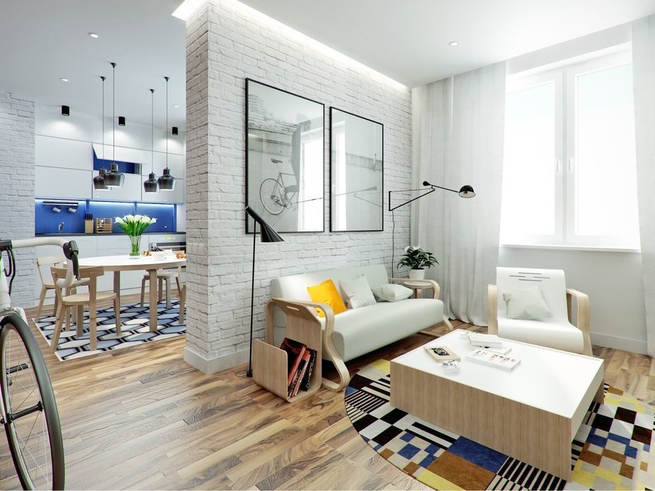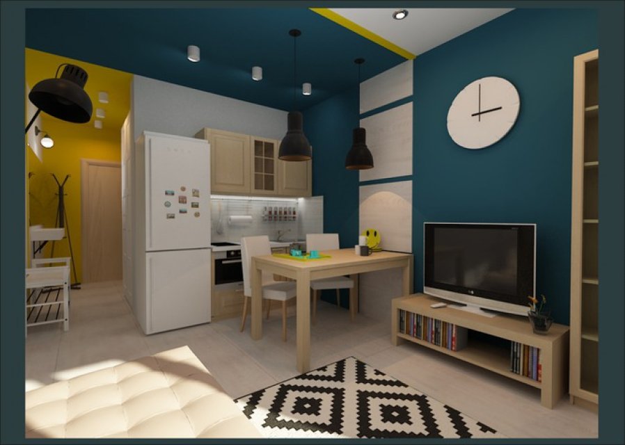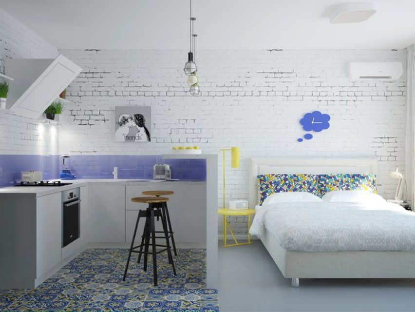 Gracias a la combinación de diferentes colores en el estudio, puede llevar a cabo una zonificación simple sin instalar particiones. El color principal para toda la casa puede ser blanco, crema, beige. En el área de recreación, intercaladas con verde oliva o verde claro cálido, azul, turquesa están permitidas. Contribuyen a la relajación y la armonía. El área de trabajo de la cocina se puede decorar en colores brillantes intercalados con marrón, burdeos o azul. Este diseño simplificará el mantenimiento de la limpieza (no se destacan tales tonos de contaminación en el acabado). Además, esta opción "revivirá" la parte de la casa donde la familia cocinará y comerá juntos. Al crear un diseño personalizado, se permite estilizar una o dos paredes de ladrillo en blanco, crema o marrón claro. Su presencia evitará la frescura del diseño y lo hará expresivo.