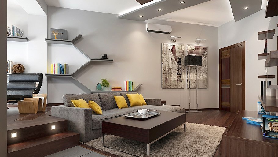 La creación de la luz adecuada (cuando cada esquina de la habitación está bien iluminada) se logra combinando varios tipos de accesorios de iluminación. Y con bastante frecuencia, la luz artificial se vuelve indispensable incluso durante el día. Tal situación se puede observar en una vivienda donde se instala una ventana estrecha. Como accesorios principales, los modelos de punto de techo ubicados alrededor del perímetro son adecuados. Reemplácelos con una lámpara de araña cuadrada o rectangular con lámparas LED brillantes. Para la iluminación competente de una habitación no estándar (alargada, con paredes sobresalientes redondeadas), se permite un par de focos con 2-3 lámparas o 2 apliques con cortinas nítidas. Si se incluye una logia en la sala de estar para aumentar el total de metros cuadrados, entonces se ilumina por separado con focos. Se les permite montar incluso en las paredes. Pero el uso de lámparas de pie en cualquier parte de la casa está prohibido.