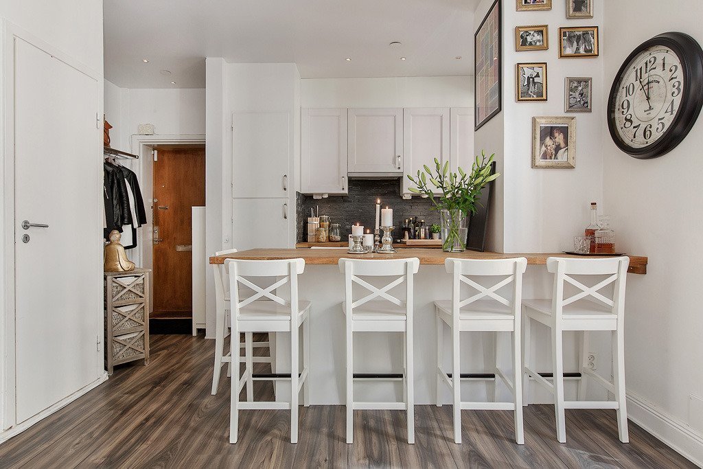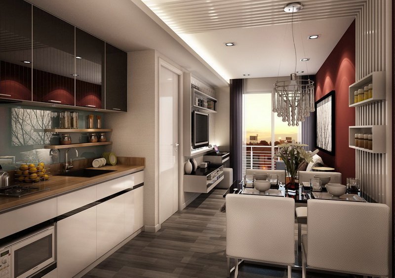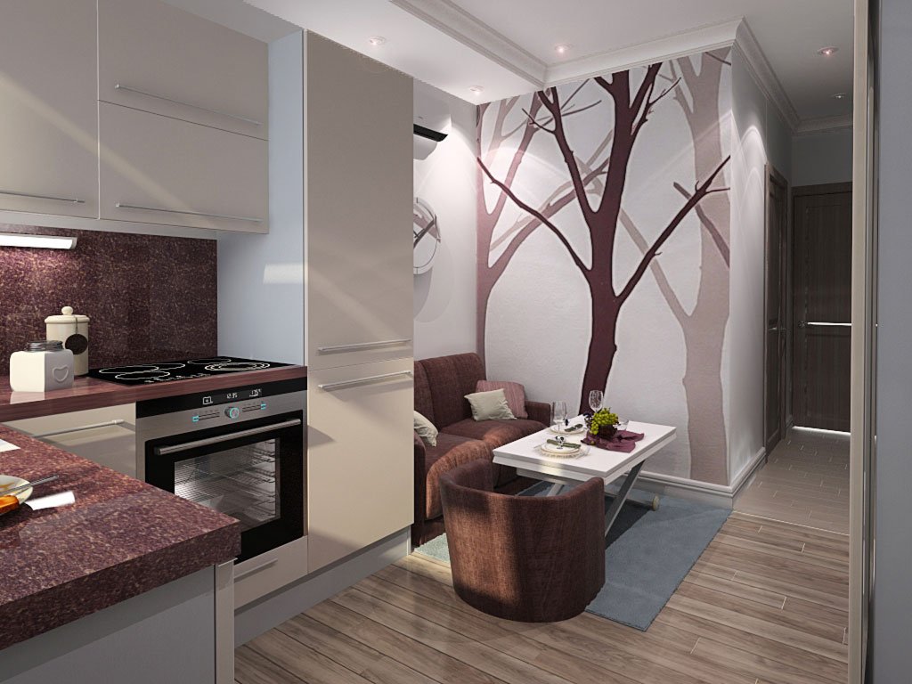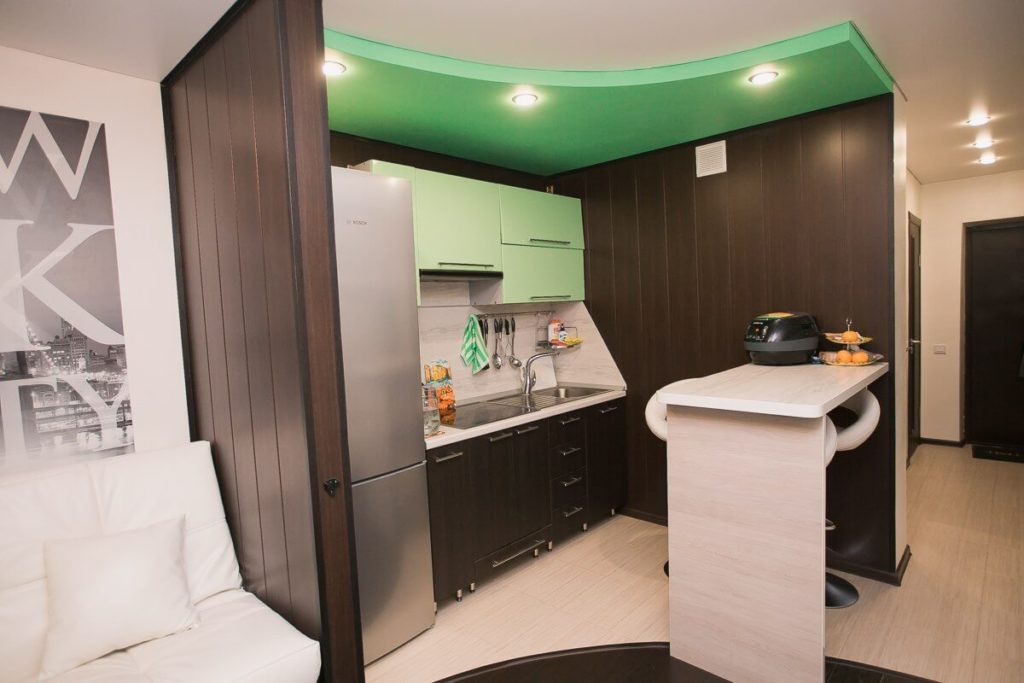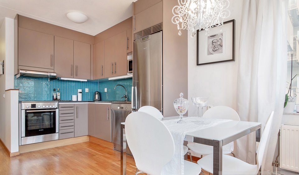 Use cada sq. El medidor en la cocina permite sabiamente la instalación de electrodomésticos integrados. No debe ser grande.Para las parejas, en lugar del habitual refrigerador de dos cámaras, es adecuado un mini modelo, que se monta debajo de la encimera. Los auriculares seleccionados pueden tener forma de L, ser rectos. Equipando muebles con rincones mágicos, columnas extensibles son bienvenidas. El relleno de alta calidad le permitirá almacenar convenientemente utensilios y utensilios, es fácil tener acceso a varios artículos de cocina. Al combinar el comedor con la cocina, se recomienda instalar una barra de bar en lugar de una mesa de comedor. En su interior debe haber estantes para guardar la vajilla. Para la encimera, debe elegir un tubo de barra con estantes, cestas de malla. Son adecuados para almacenar especias, frutas, botellas, vasos para beber.
