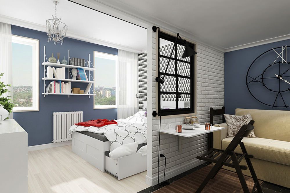 La combinación de dormitorio y sala de estar debe llevarse a cabo mediante la separación condicional de estos locales. Limitar el espacio para la relajación personal ayudará a un arco delgado, la instalación de un gabinete de luz, un estante con una altura promedio. En presencia de un balcón calentado, puede llevar una cama para dormir en forma de colchón con base (sin costados ni apoyabrazos). Es adecuado para organizar una oficina, capacitación o sala de juegos para un niño. En la parte de la sala reservada para actividades de ocio, se permite la instalación de una mini-pared con TV. Si el televisor se instalará en la pared, debajo puede colocar una cómoda, un armario para guardar revistas, periódicos. Los sillones o sillas deben reemplazarse por un sofá con compartimentos interiores para la ropa de cama, no artículos de temporada. En la pared sobre el sofá puedes colgar un par de gabinetes, estantes o hacer un nicho escondido.