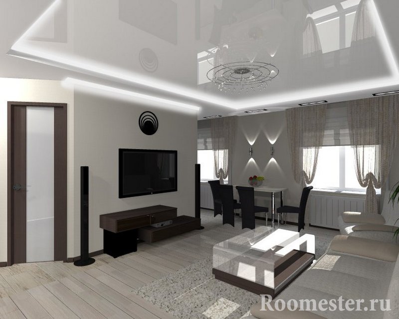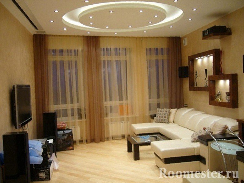 la construcción de paneles de yeso de varios niveles establece el estilo, haciendo que los apartamentos sean visualmente más altos;
