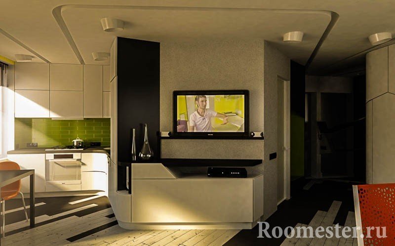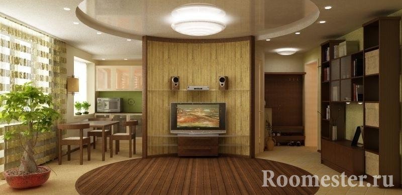 Demoler todas las particiones que no están soportando, convirtiendo el apartamento en un apartamento tipo estudio. Designe las áreas de la cocina, comedor, sala de estar, resalte la oficina, guardería. Para distinguir entre zonas, particiones de luz, un piso de varios niveles, transiciones de color de decoración, diferentes tipos de cobertura, etc.