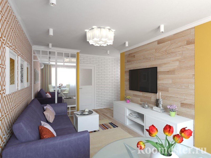 Si combinó sus tres habitaciones en un estudio, la zonificación es un requisito previo. Un piso de varios niveles con un revestimiento diferente es increíblemente impresionante. Las paredes también están pintadas en varios colores (use papel tapiz, pintura o yeso decorativo). El resultado es una casa espaciosa y elegante con mucho aire y luz.