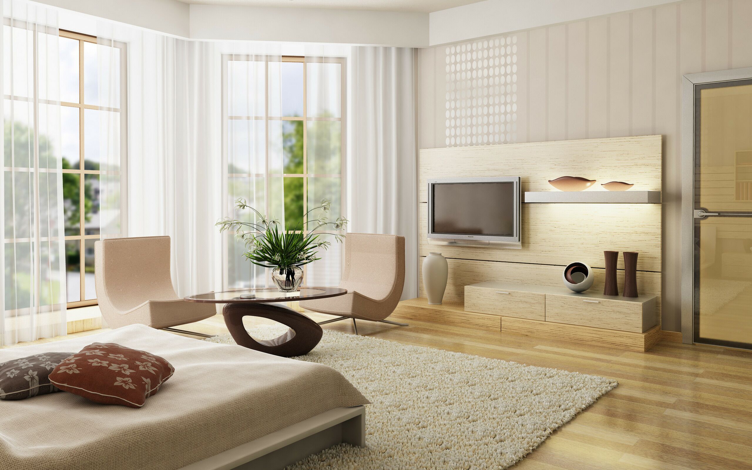 La combinación de colores del interior depende del estilo de diseño elegido. Es mejor elegir 3 colores básicos alrededor de los cuales construir más diseños. Un tono tranquilo con mayor frecuencia se convierte en el fondo, y los otros dos lo complementan perfectamente. En habitaciones grandes, los interiores completamente monocromáticos no se ven; no deberían incluirse en el proyecto. Esto es especialmente cierto para el blanco. También vale la pena abandonar la decoración interior en un color, ya que las superficies de diferentes texturas pintadas en el mismo tono se ven diferentes y, a menudo, no se combinan entre sí. Si se introduce un tono brillante (rojo brillante, amarillo ácido, fucsia) en el interior, debe diluirse con pinturas neutras (beige, gris, rosa pálido). Si hablamos de combinaciones específicas de tonos, entonces, en apartamentos de tres habitaciones, estos colores coexisten bien: