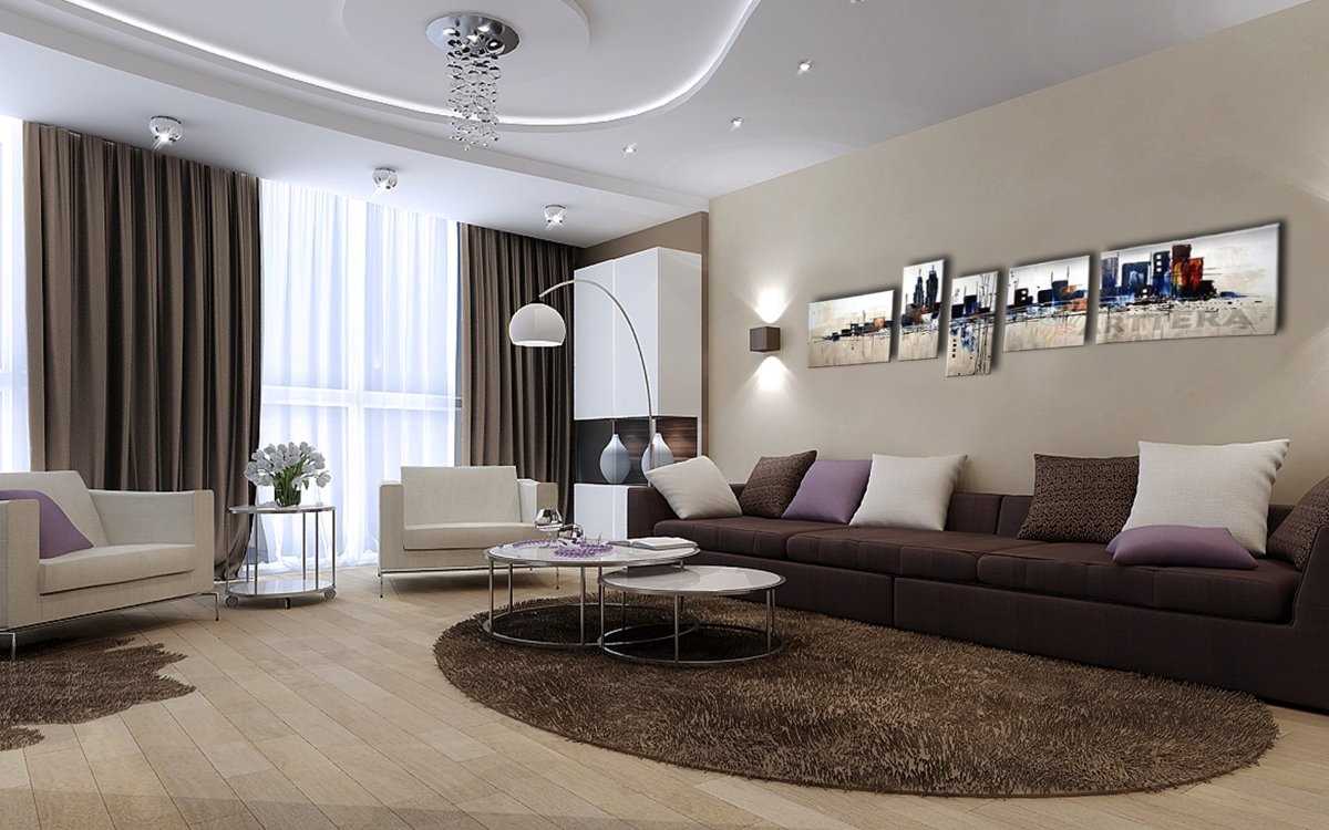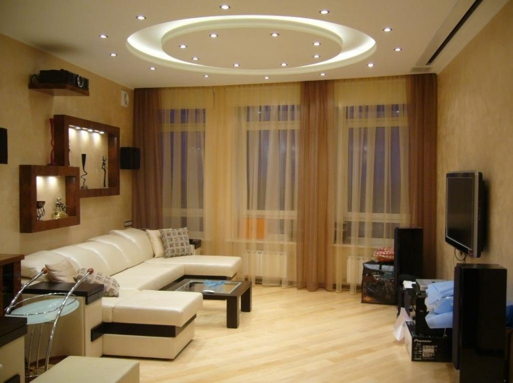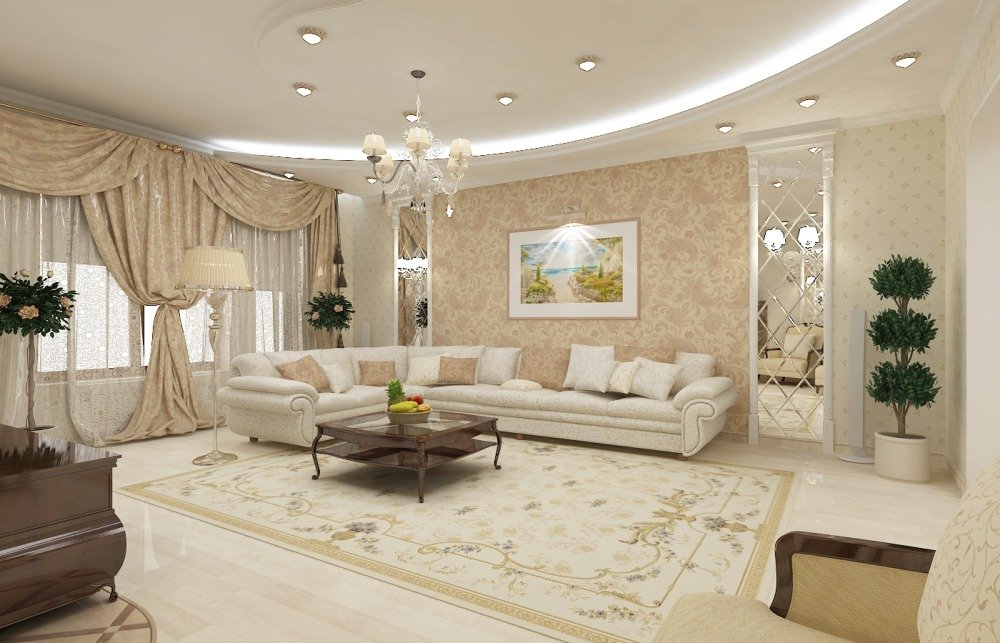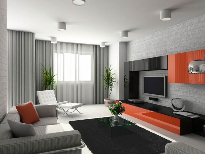 La sala de estar debe ocupar la habitación más grande del apartamento o aquella en la que hay dos o tres ventanas. Debería ser una habitación luminosa y espaciosa, que ilustra completamente el estilo principal del apartamento. Dado que se supone que esta sala debe celebrar reuniones familiares, debe estar equipada con la cantidad necesaria de muebles cómodos y funcionales, así como una chimenea eléctrica. La sala de estar es una de las habitaciones obligatorias del apartamento, pero se puede combinar con el dormitorio de invitados y poner sofás plegables aquí. También en esta sala hay estanterías y un televisor. Las ventanas no pueden cortarse o pueden colgarse cortinas translúcidas claras. En la sala de estar, una lámpara de techo grande y un par de apliques de pared serán apropiados. Las lámparas de pie no son apropiadas en todos los interiores, por lo tanto, antes de instalar una lámpara de pie, debe consultar con un diseñador. Además, esta sala se puede decorar con flores interiores artificiales y reales en jarrones y macetas.