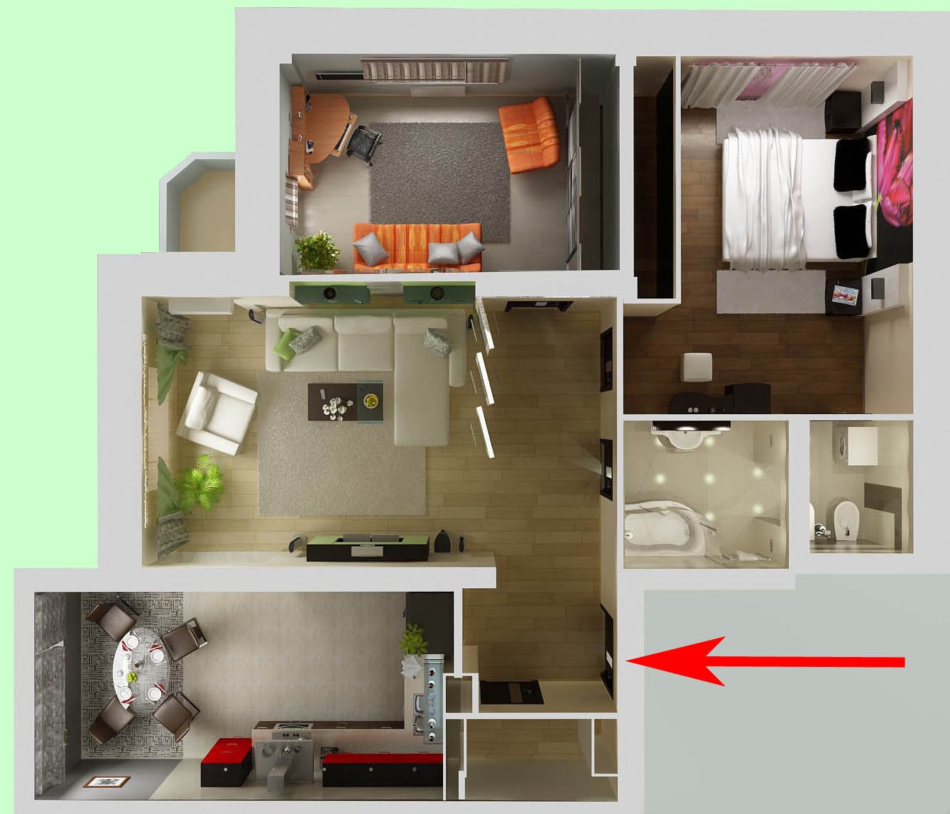 La habitación puede ser la habitación más pequeña del apartamento, ya que implica intimidad y privacidad. Debe decorarse con colores suaves y tranquilos, ya que los tonos ácidos pueden ser molestos. Es mejor colgar cortinas pesadas en las ventanas que no dejan entrar la luz del sol cuando hay cortinas.