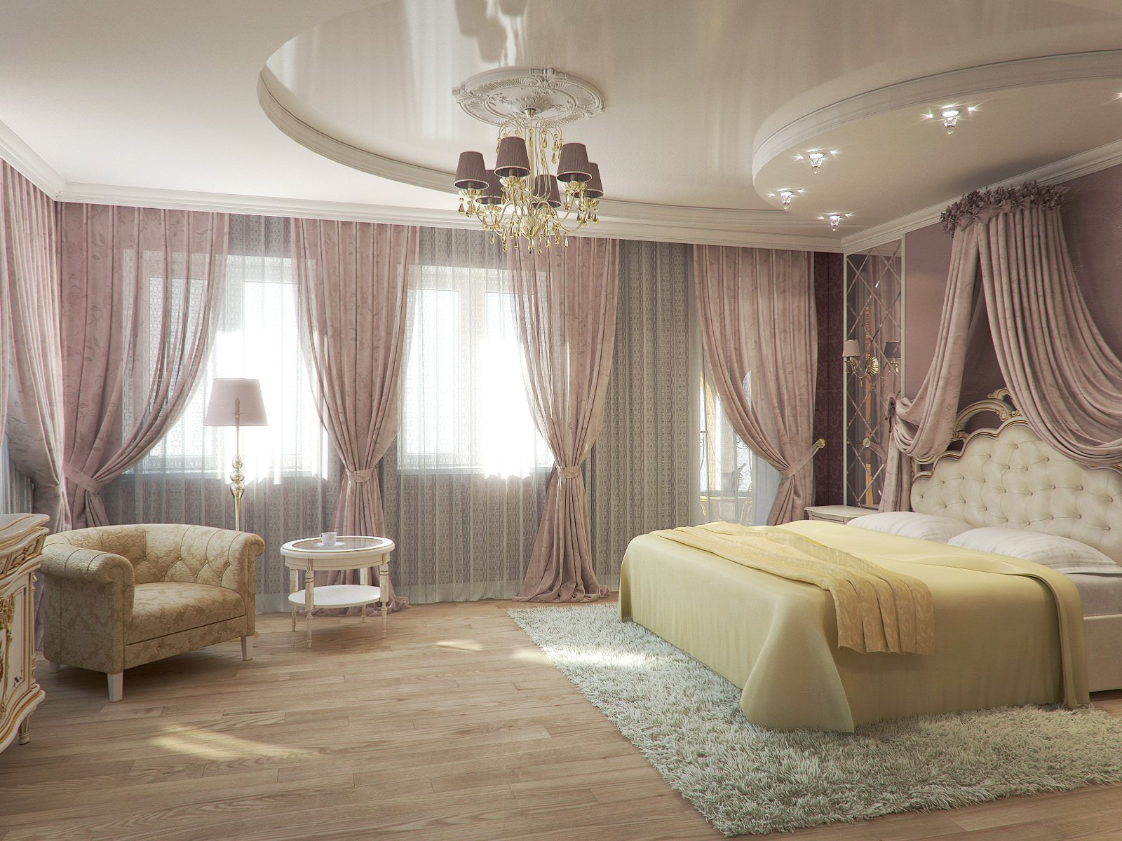 Incluso los buenos sofás duros afectan negativamente la postura. La cama de la habitación debe guardarse lejos de la ventana e incluso puede cerrarla con un dosel.La decoración adicional de la habitación depende de las preferencias individuales de los propietarios. Aquí puedes poner un escritorio, tocador, sillón, armarios con ropa, etc. Por supuesto, no debe hacer muebles adicionales para la habitación, pero esta habitación debe ser funcional. Para la comodidad de los propietarios, debe haber dos tipos de lámparas: techo (lámpara de araña ordinaria) y mesita de noche (lámparas, apliques o lámparas de pie).