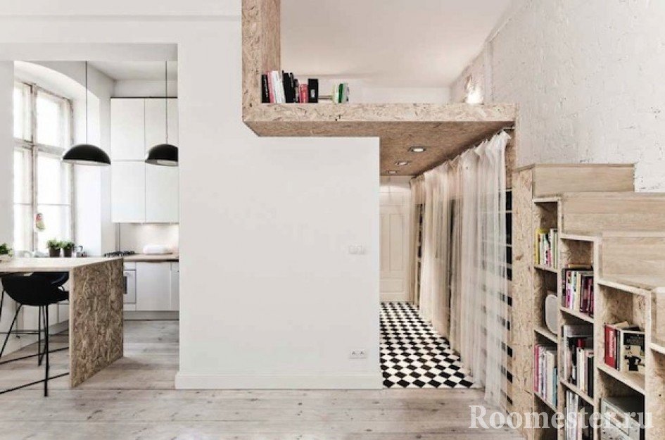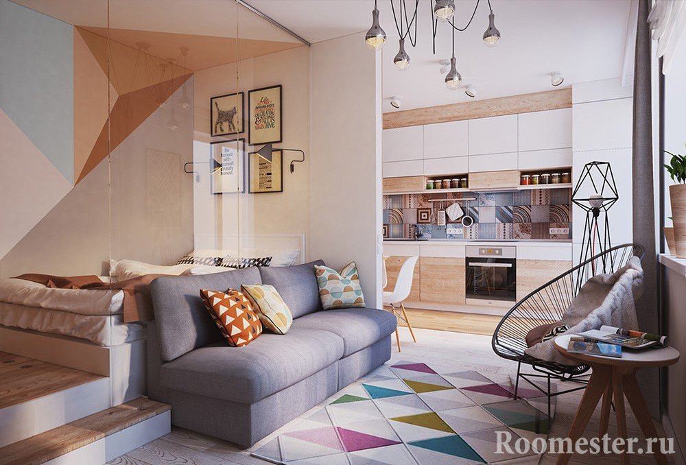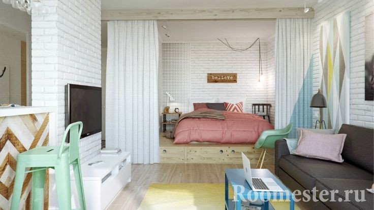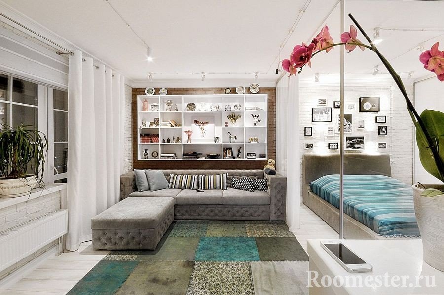 En su ejecución, este es uno de los trucos más difíciles y no siempre exitosos cuando se trata de un apartamento de una habitación. Aquí, los principios de zonificación y consejos para aumentar visualmente el choque espacial se contradicen entre sí. En un área pequeña, las transiciones de color demasiado brillantes y los acabados de texturas múltiples no serán apropiados. El borde se puede dibujar en el piso, por ejemplo, agregue una alfombra, resaltando el área deseada.