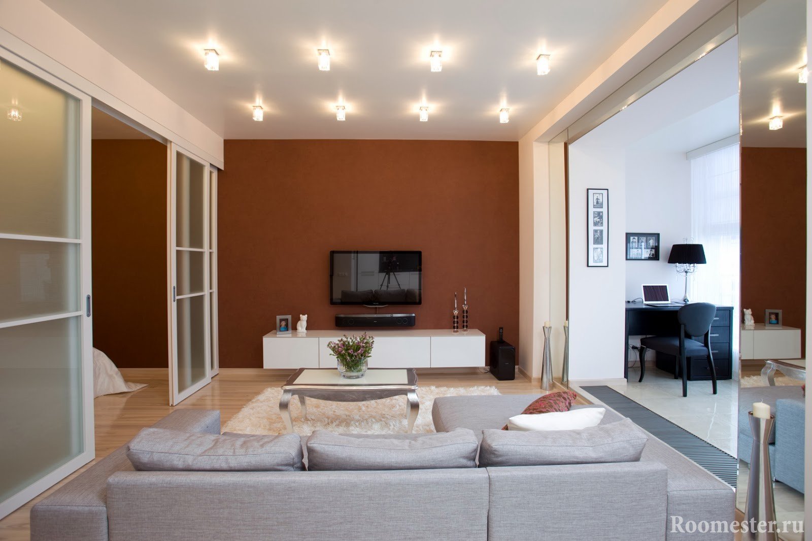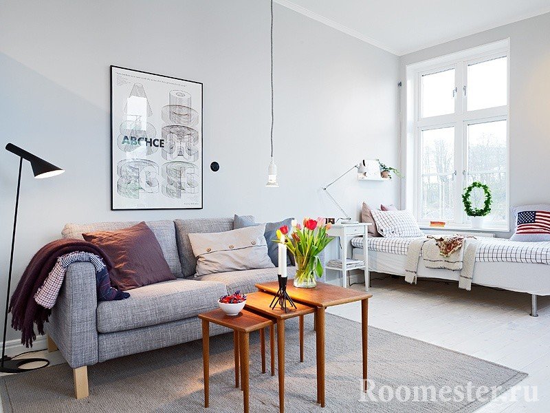Dio la casualidad de que solíamos arreglar los muebles alrededor del perímetro, pero a veces vale la pena revisar las vistas conservadoras. La disposición de los muebles es una de las formas más fáciles y convenientes de zonificar una habitación. La habitación de invitados puede estar separada del dormitorio por un armario alto y estrecho con puertas que dan a la cama. Un sofá o una barra de bar dividirán el área de recreación con una cocina y un estante o una mesa con algo que pueda servir como un limitador del lugar de trabajo.