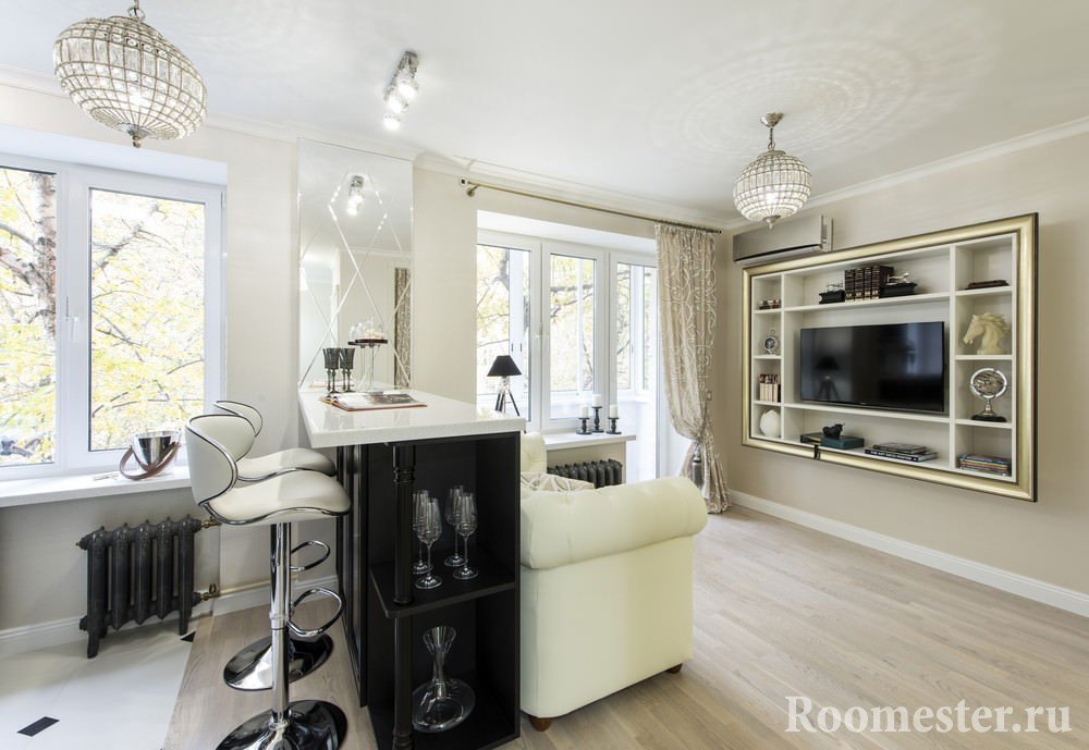 Por lo general, en la reparación de apartamentos de una habitación, el principal problema radica en el tamaño y el espacio aparentemente limitado. Doblemente más pesado para familias con niños. Por lo tanto, la tarea principal es aumentar el tamaño, al menos visualmente.Una opción más cardinal será un cambio completo en la apariencia: la demolición de muros y la reurbanización. Los estudios se están volviendo cada vez más populares, en los que la cocina, la sala de estar y el pasillo se convierten en uno. Por supuesto, está de moda, es práctico, pero muy caro. Una opción que consume menos tiempo será la demolición de una pared, por ejemplo, combinando una cocina con un pasillo o una habitación con balcón.