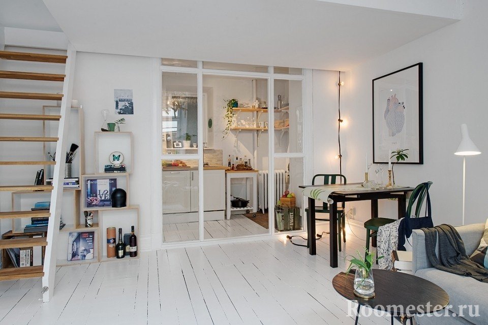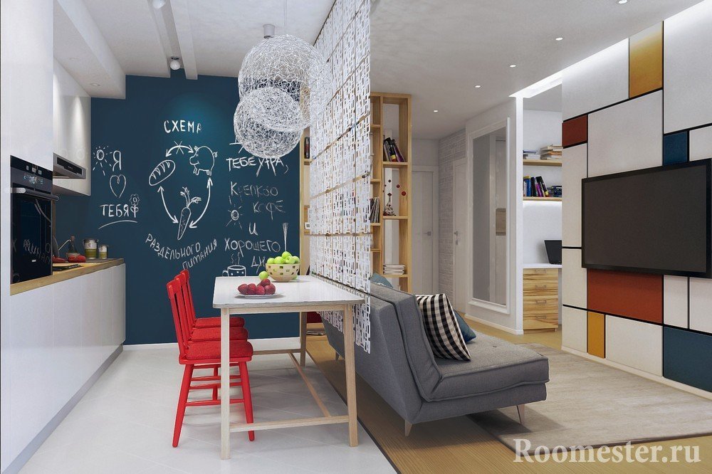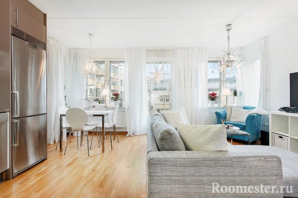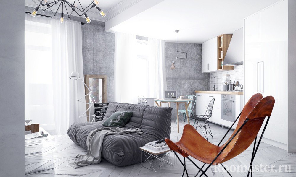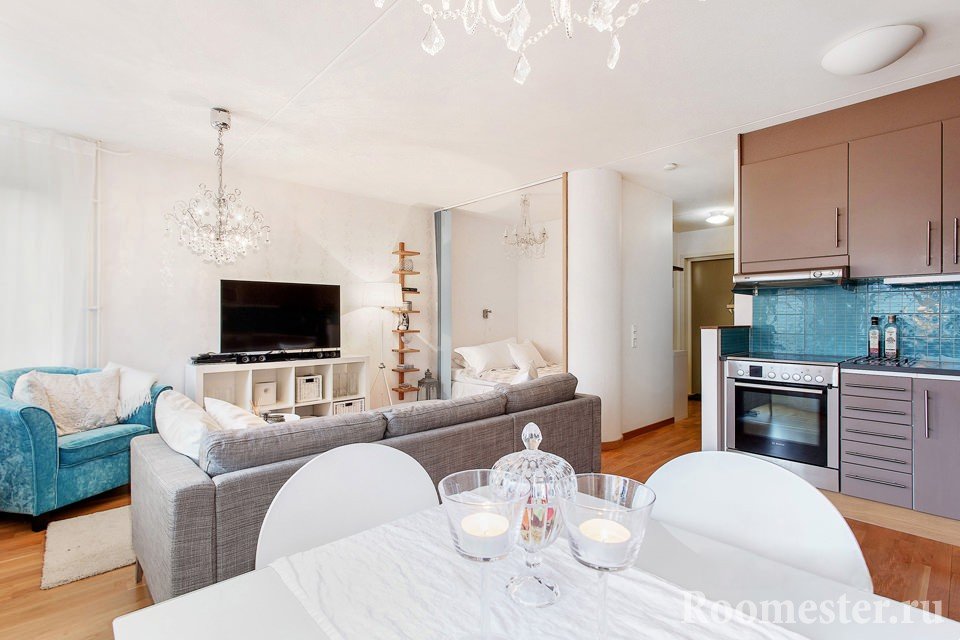 Pensando en el diseño, es importante determinar el estilo original y tener en cuenta que algunos de ellos simplemente no pueden reproducirse completamente en un área pequeña. Inmediatamente es necesario abandonar los clásicos, el país, la antigüedad o la dirección estadounidense. Las tendencias minimalistas se volverán óptimas: estilo escandinavo, también sueco, alta tecnología, eclecticismo. Un apartamento moderno también debe usar materiales modernos para la decoración y la decoración. Las puertas batientes se pueden reemplazar con particiones deslizantes o incluso abandonarlas en favor de los arcos.