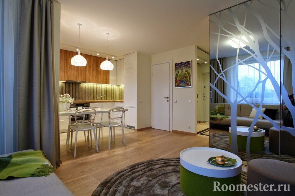La solución óptima para un apartamento moderno de una habitación será verde claro, arena, crema, gris, marrón, azul o amarillo.