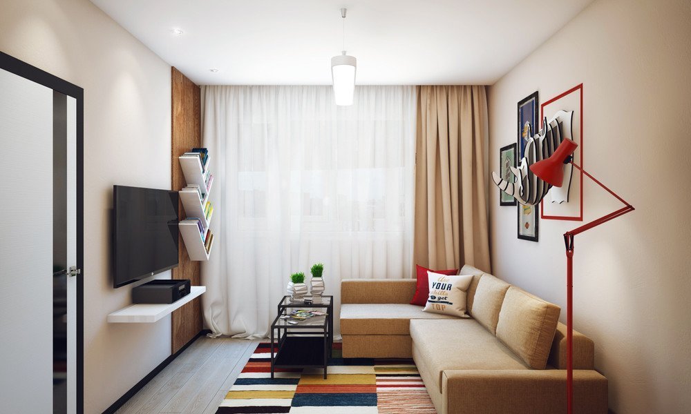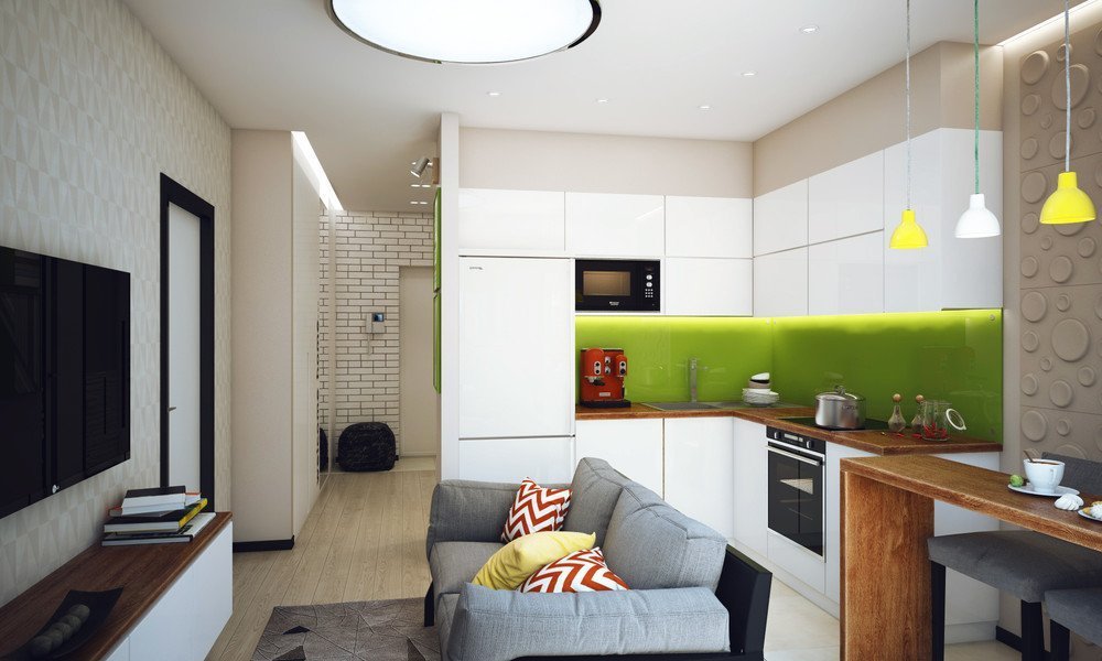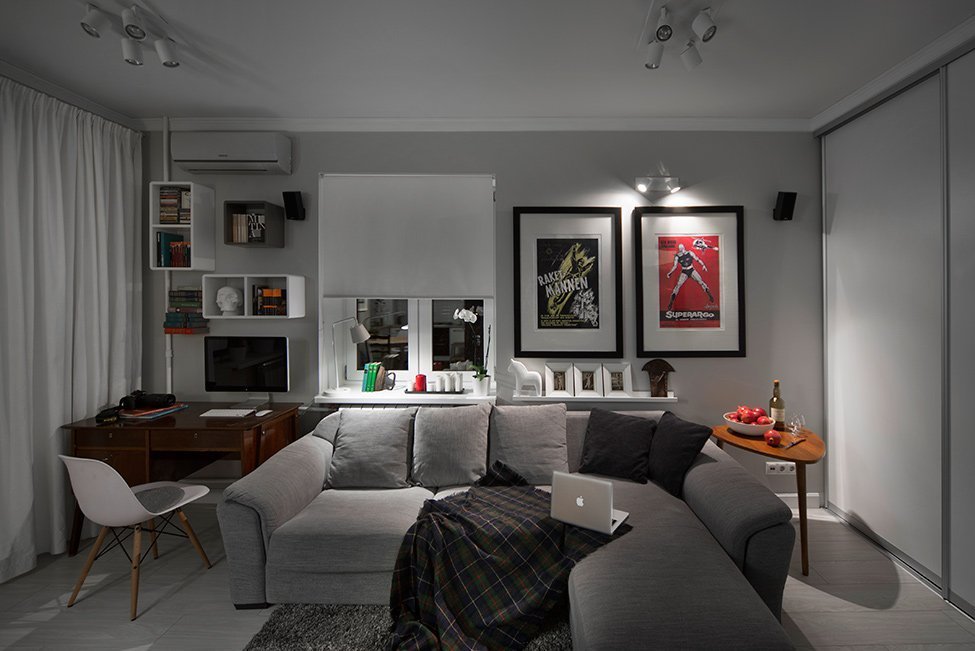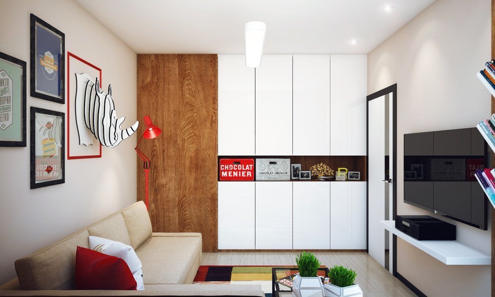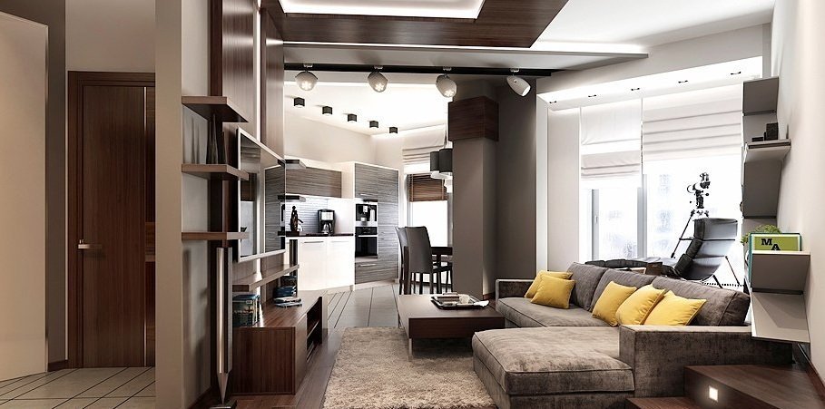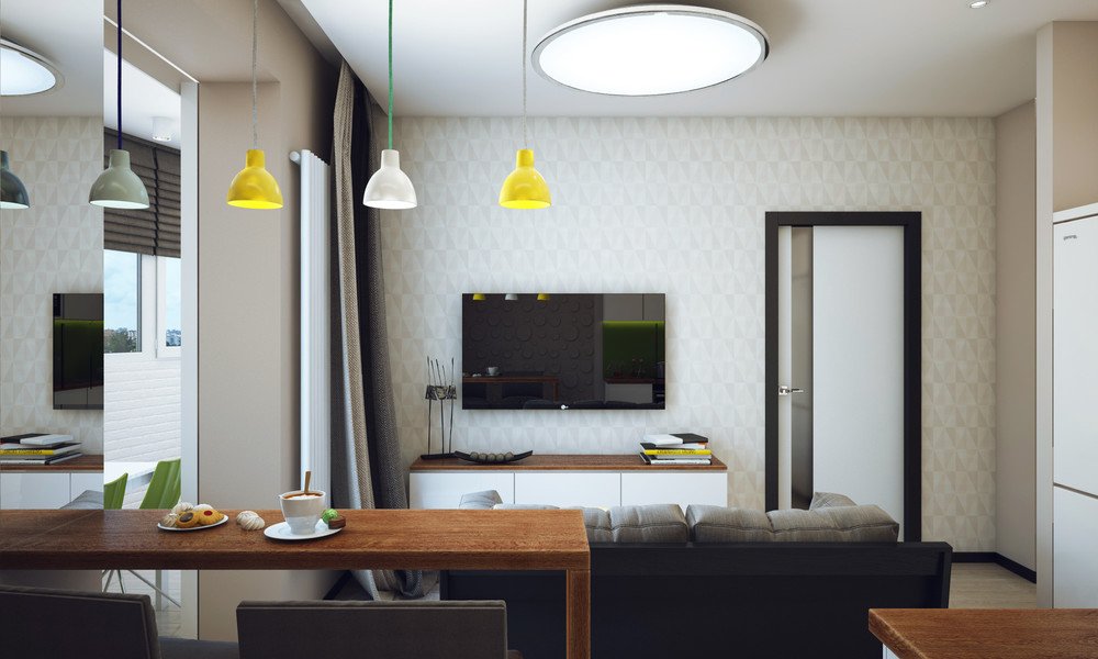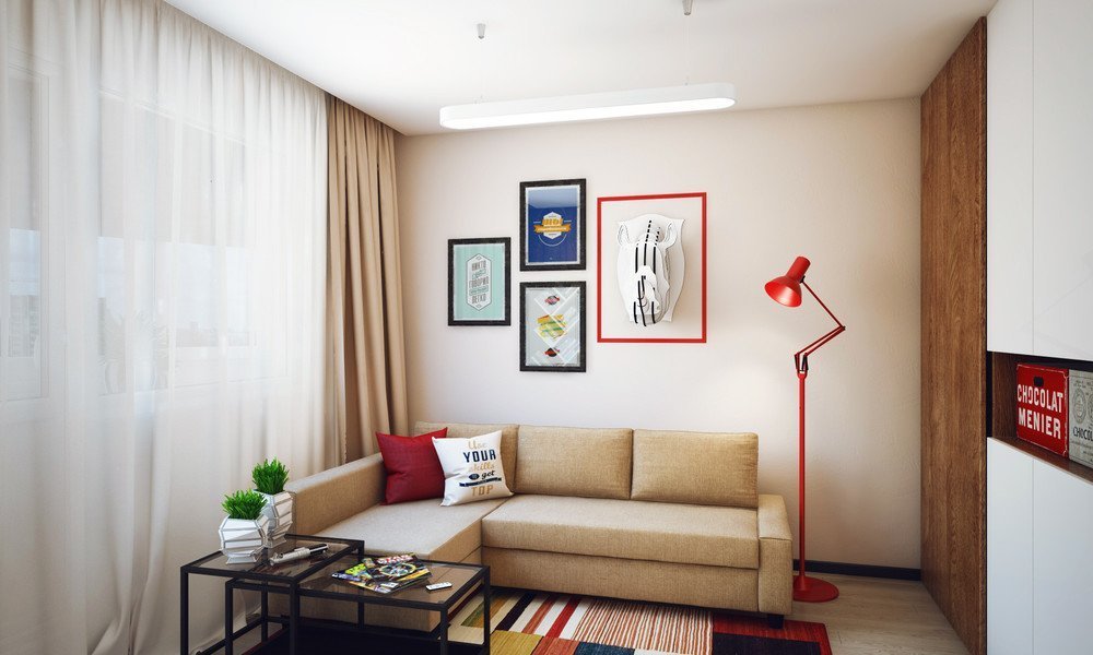 Si la sala de estar se combina con la cocina, entonces es necesario resaltar la sala de estar en ella.Para hacer esto, puede usar el color y hacer que este lugar sea más brillante. Por ejemplo, el área para dormir está decorada en arena y la sala de estar es de color amarillo brillante. Al mismo tiempo, los estilos de diseño de la cocina y la sala de estar deben coincidir o combinarse bien. Si la habitación no está conectada a la cocina, generalmente desempeña simultáneamente el papel de dormitorio y sala de estar. Un sofá cama doble se ensambla y se convierte en muebles tradicionales para la sala de estar. En este caso, debe haber una mesa de café en la habitación, que, cuando se despliega el sofá, se mueve hacia la pared. Si el tamaño de la habitación lo permite, puede colocar inmediatamente un sofá y una cama. Al mismo tiempo, el área de la sala de estar, donde se encuentra el sofá plegable, se distingue por el color, los elementos decorativos o un estante del armario sin una pared posterior.