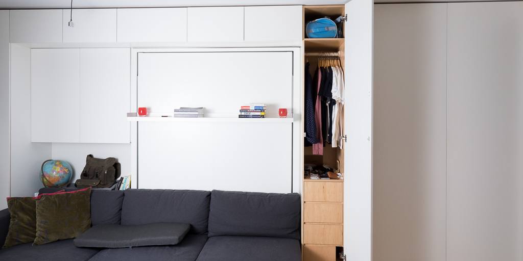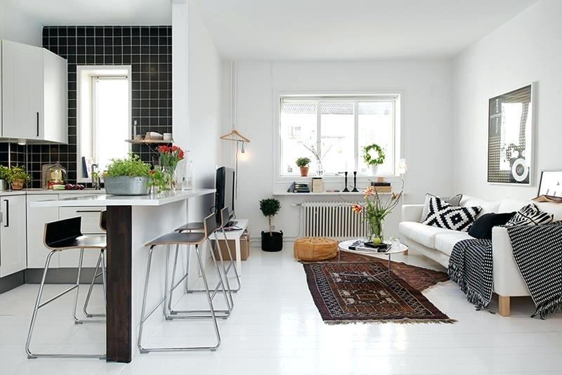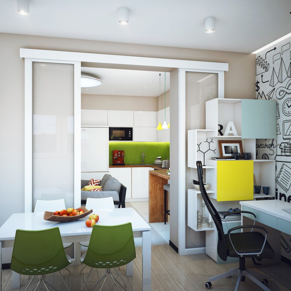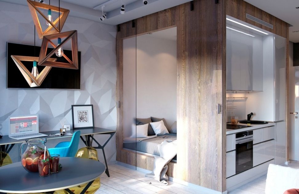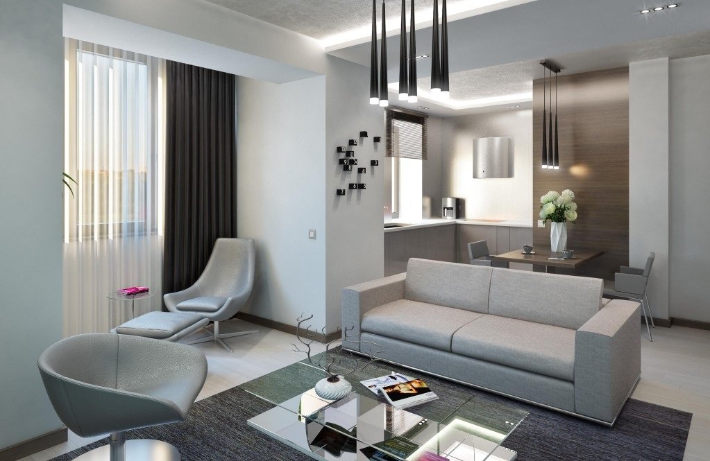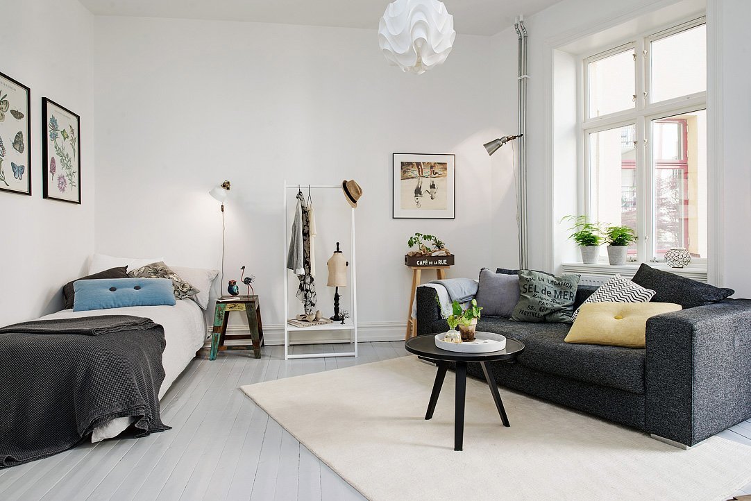Si la sala de estar se combina con la cocina, entonces es necesario resaltar la sala de estar en ella.Para hacer esto, puede usar el color y hacer que este lugar sea más brillante. Por ejemplo, el área para dormir está decorada en arena y la sala de estar es de color amarillo brillante. Al mismo tiempo, los estilos de diseño de la cocina y la sala de estar deben coincidir o combinarse bien. Si la habitación no está conectada a la cocina, generalmente desempeña simultáneamente el papel de dormitorio y sala de estar. Un sofá cama doble se ensambla y se convierte en muebles tradicionales para la sala de estar. En este caso, debe haber una mesa de café en la habitación, que, cuando se despliega el sofá, se mueve hacia la pared. Si el tamaño de la habitación lo permite, puede colocar inmediatamente un sofá y una cama. Al mismo tiempo, el área de la sala de estar, donde se encuentra el sofá plegable, se distingue por el color, los elementos decorativos o un estante del armario sin una pared posterior.