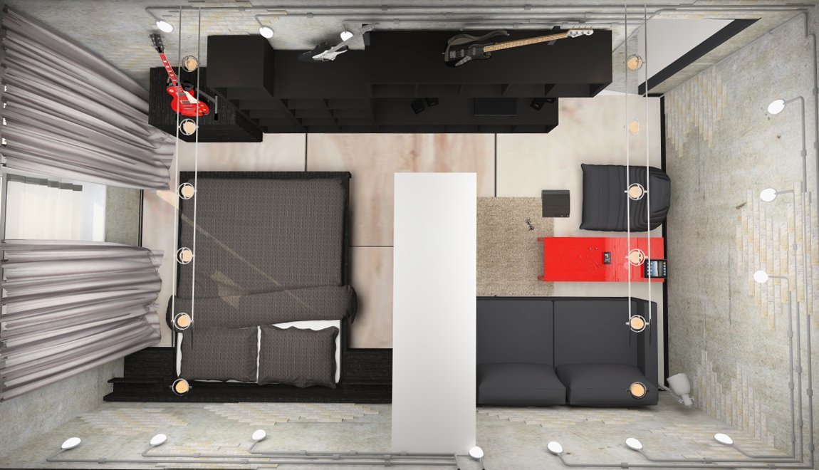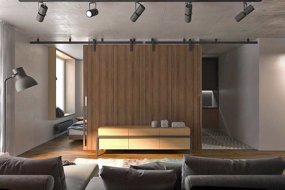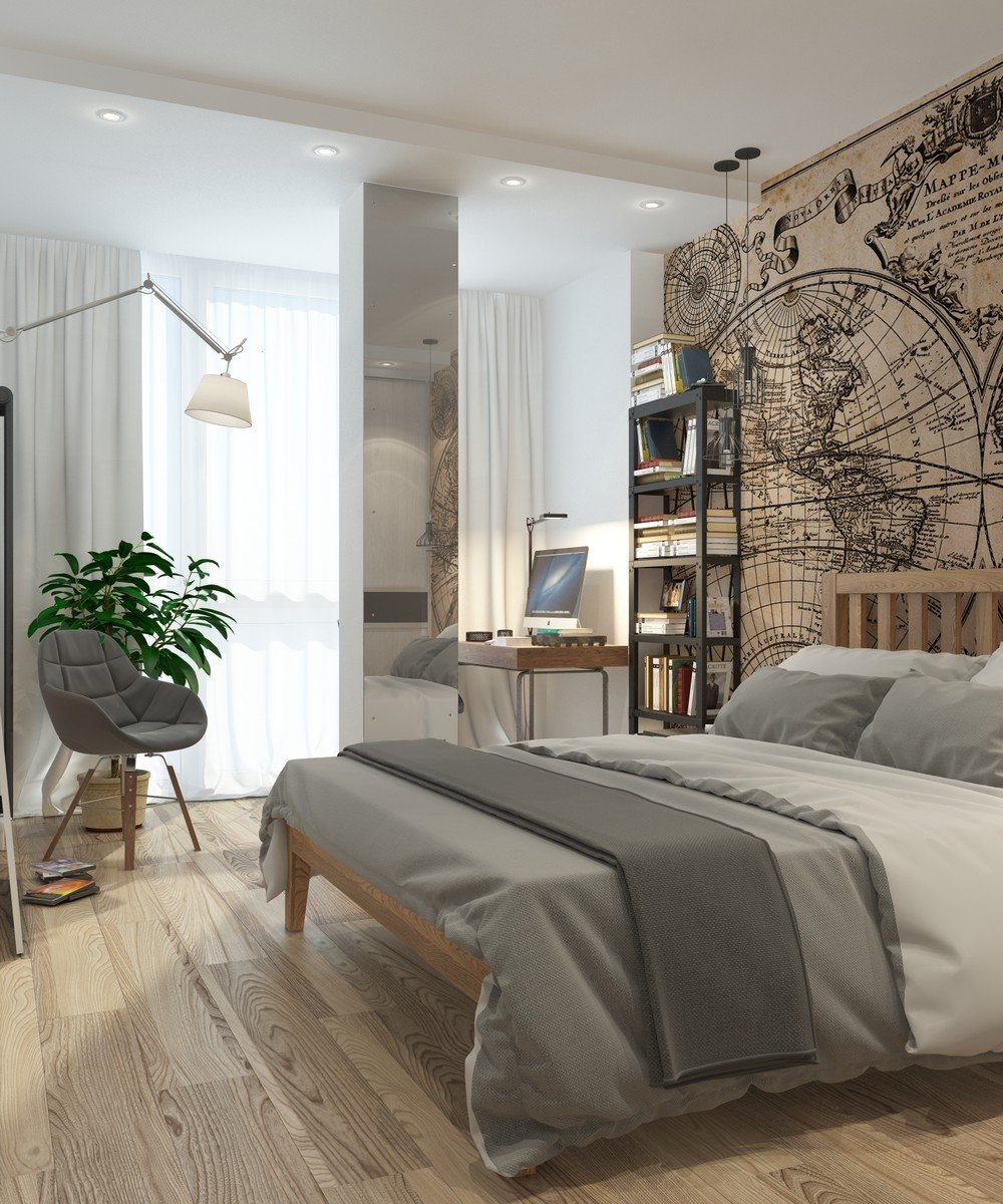 Los tamaños de los apartamentos de una habitación no son muy grandes, por lo que no funcionará para realizar absolutamente ninguna idea de diseño. Al zonificar las instalaciones, primero debe decidir sobre la posibilidad de reurbanización. Si el propietario de los bienes inmuebles está listo para la revisión con la transferencia de muros, entonces hay más oportunidades para la zonificación. Si esto no es posible, entonces es necesario desarrollar un proyecto de diseño en el que las áreas del apartamento se resalten con la ayuda del color o algún tipo de mobiliario. Pero los interiores en el estilo de los hombres son inicialmente muy concisos, por lo que la división en zonas puede ser completamente arbitraria. En el estudio solo necesita identificar lugares para dormir y comer, y en apartamentos ordinarios en habitaciones, con acentos de color, puede asignar un lugar para deportes. Al desarrollar un proyecto de diseño, se piensa en el interior de todas las habitaciones del apartamento: