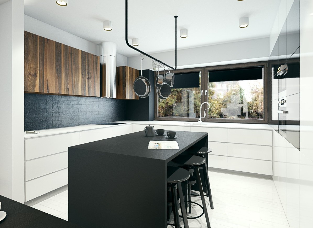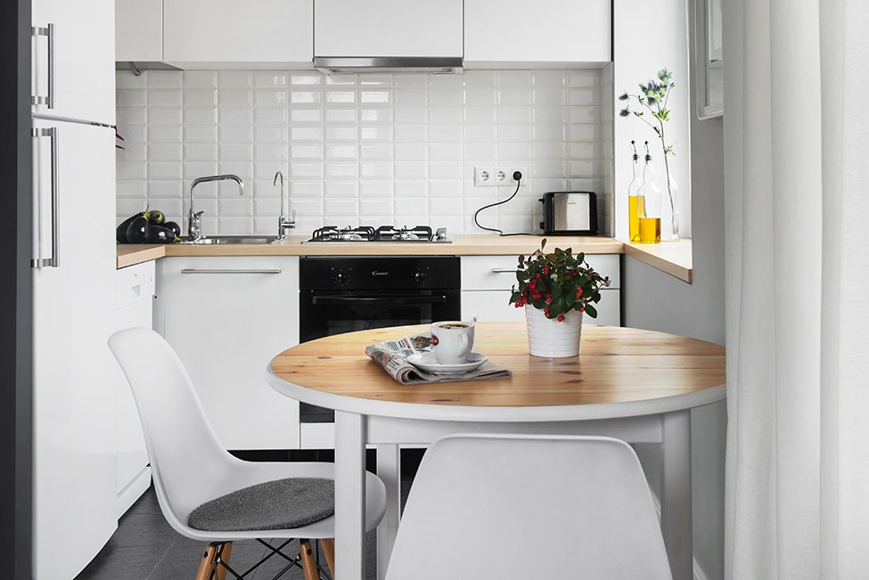 El diseño de la cocina y la sala de estar debe comenzar con una opción de iluminación. La luz blanca cálida es apropiada aquí, porque crea una atmósfera de confort. La comida iluminada por luz blanca se ve muy apetitosa. El color del juego de cocina depende de las preferencias personales del joven. Es mejor elegir gabinetes de madera cerrados con salpicaduras de metal. Debe haber muchos gabinetes, ya que almacenarán equipos para cocinar (licuadora, procesador de alimentos, tostadora, olla de cocción lenta, etc.). A los hombres no siempre les gusta cocinar en la estufa o en el horno. La mesa de comedor puede ser cualquier cosa. Su tamaño depende del área de la cocina, pero en los apartamentos de soltero no hay necesidad de mesas grandes. Incluso puedes limitarte a un bar. Este elemento es ideal para la planificación del estudio, cuando desea zonificar el espacio en la cocina y la sala de estar.