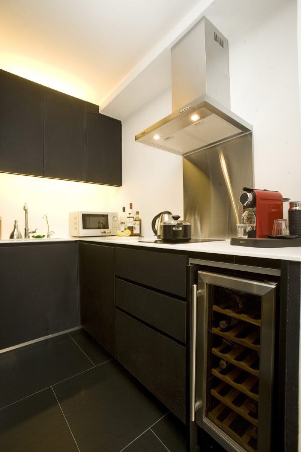 En un departamento donde vive un hombre soltero, todo debe estar a la mano. Al mismo tiempo, no hay necesidad de tirar basura a la carcasa, por lo tanto, al desarrollar el diseño de dichos locales, debe cuidar una gran cantidad de lugares para almacenar cosas. Pero los gabinetes no deberían reducir en gran medida la habitación, porque la mayoría de los hombres prefieren habitaciones espaciosas. Debido a esto, en lugar de parte de los gabinetes cerrados, vale la pena colgar varios estantes. El interior masculino se distingue por su simplicidad y concisión de formas y colores. Por lo general, a los hombres no les gusta la diversidad y la mezcla de diferentes estilos y, por lo tanto, prefieren la monotonía. En los apartamentos de los representantes de la mitad fuerte de la humanidad, a menudo se encuentra mucho negro, pero aquí es bastante apropiado. El color negro en el diseño a menudo enfatiza la fuerza del carácter, la elegancia y la seriedad del propietario.