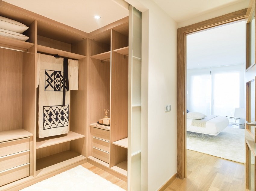 No todos los apartamentos de una habitación cuentan con un armario. Estas habitaciones son odnushki en las casas de Stalin o en los edificios nuevos. Además, a veces los camerinos no están separados inicialmente del corredor. Están limitados por puertas tipo cupé. Desde el exterior, este vestidor se asemeja a un armario ordinario, pero le permite almacenar una gran cantidad de cosas. Debe estar equipado con gabinetes y bastidores para guardar la ropa. Es mejor elegir armarios altos hasta el techo para colocar no solo ropa, sino también equipos deportivos (esquís, patines e incluso una bicicleta desmontada o doblada). Las salas de vestuario se asignan en habitaciones separadas solo en las casas de Stalin en forma de cuartos de almacenamiento completos. Pero aquí puede derribar una puerta y una pared ordinarias instalando un compartimento estándar con un espejo para aumentar visualmente el espacio.