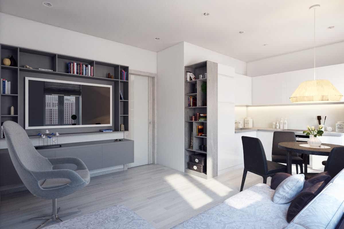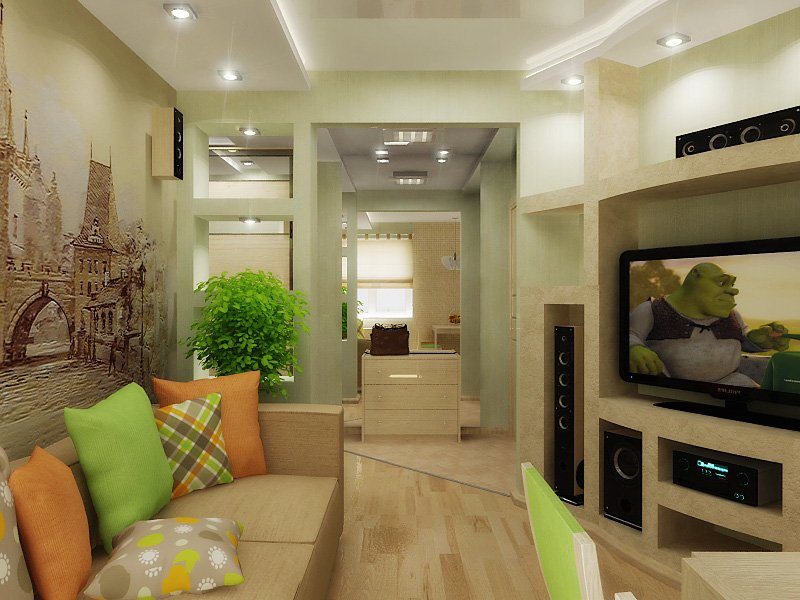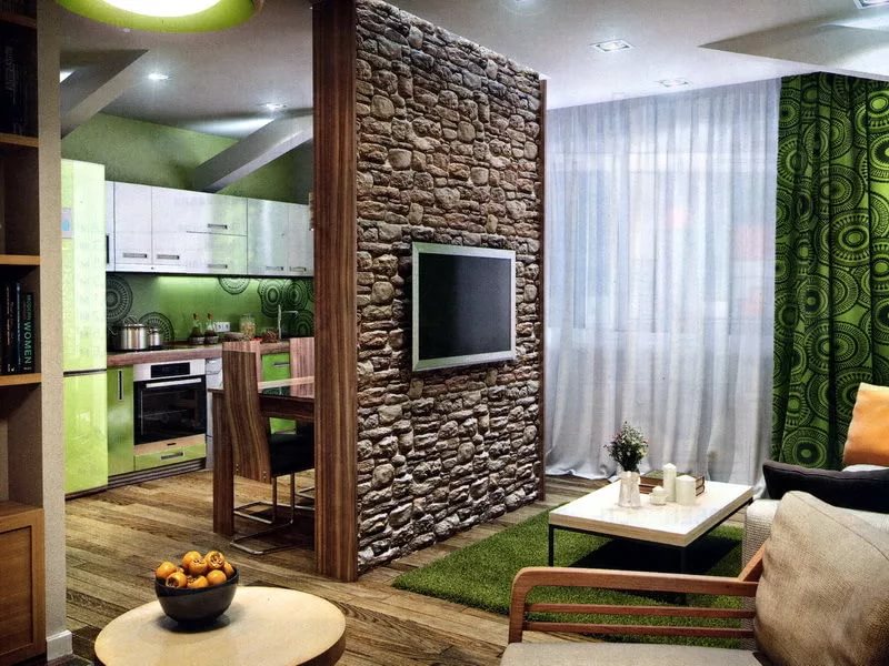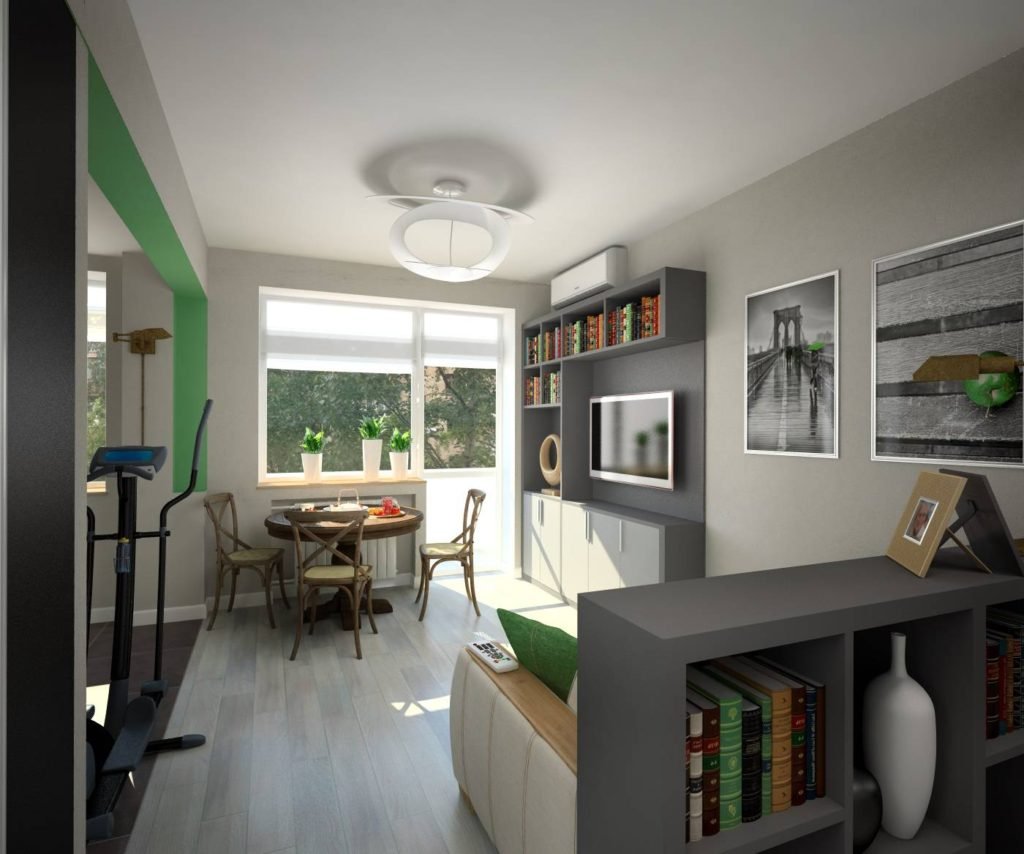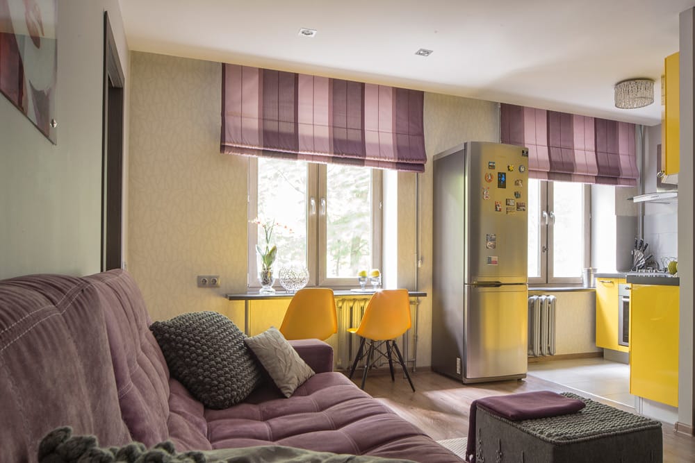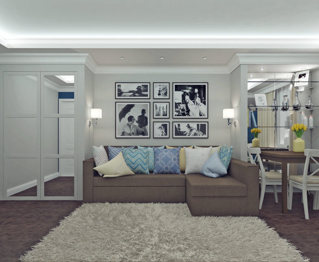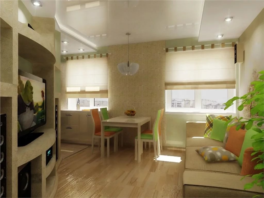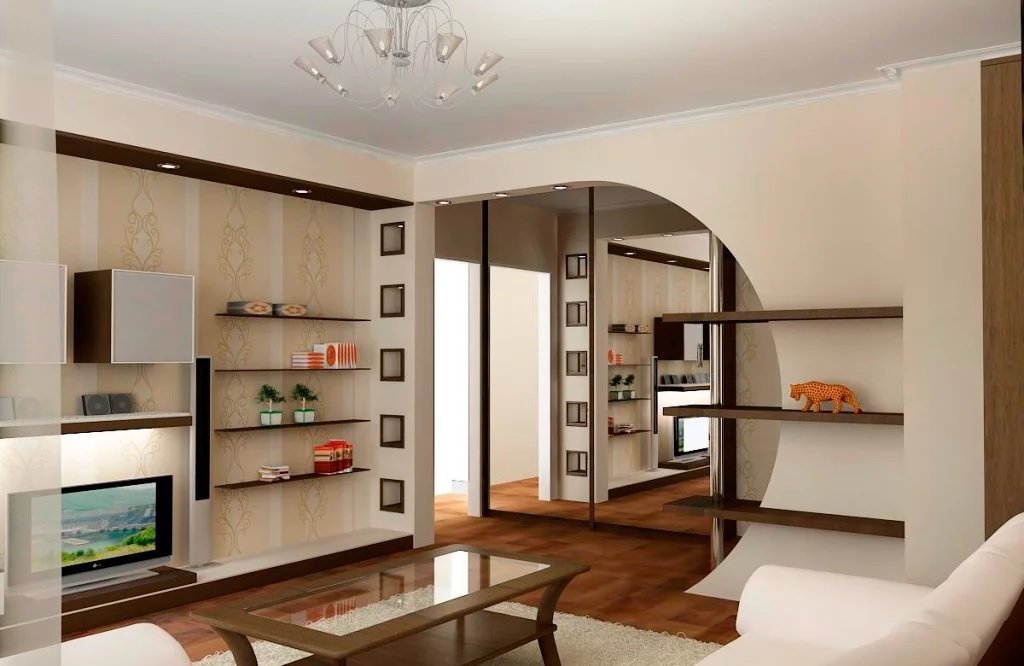 Otro tipo de diseño popular para apartamentos de dos habitaciones es la camiseta. Las ventanas en tales viviendas están orientadas en diferentes direcciones. Las habitaciones recuerdan un poco las mangas de una camisa, conectadas por un "torso" en forma de cocina o corredor. Las familias jóvenes con un niño generalmente comparten espacio, en lugar de combinarlo. En la sala grande, que se utiliza como sala de estar, se coloca una partición. Por lo tanto, resulta una pequeña guardería. Una partición es preferible a una pared de ladrillo o paneles de yeso en habitaciones donde solo hay una ventana. Para no dejar una de las habitaciones sin luz natural, la separación se realiza mejor con muebles o puertas correderas. En otras versiones, la cocina se combina con la sala de estar, a veces añadiéndoles también el pasillo. El último caso es más adecuado para viviendas de "soltero" para una persona. La combinación con la sala de estar se lleva a cabo por aquellas familias a las que les gusta albergar grandes grupos de invitados. Por lo tanto, es realmente más conveniente cocinar la cena y poner la mesa sin distraerse de la conversación.