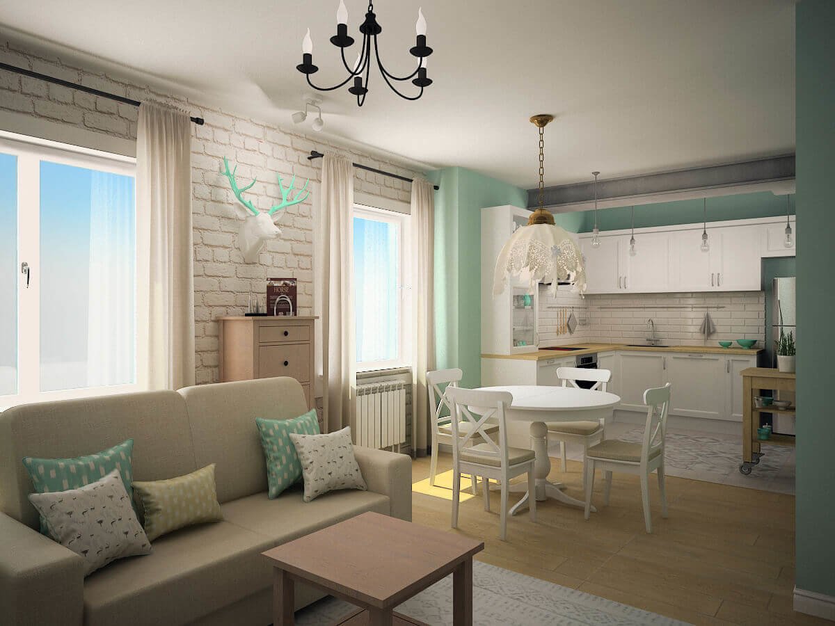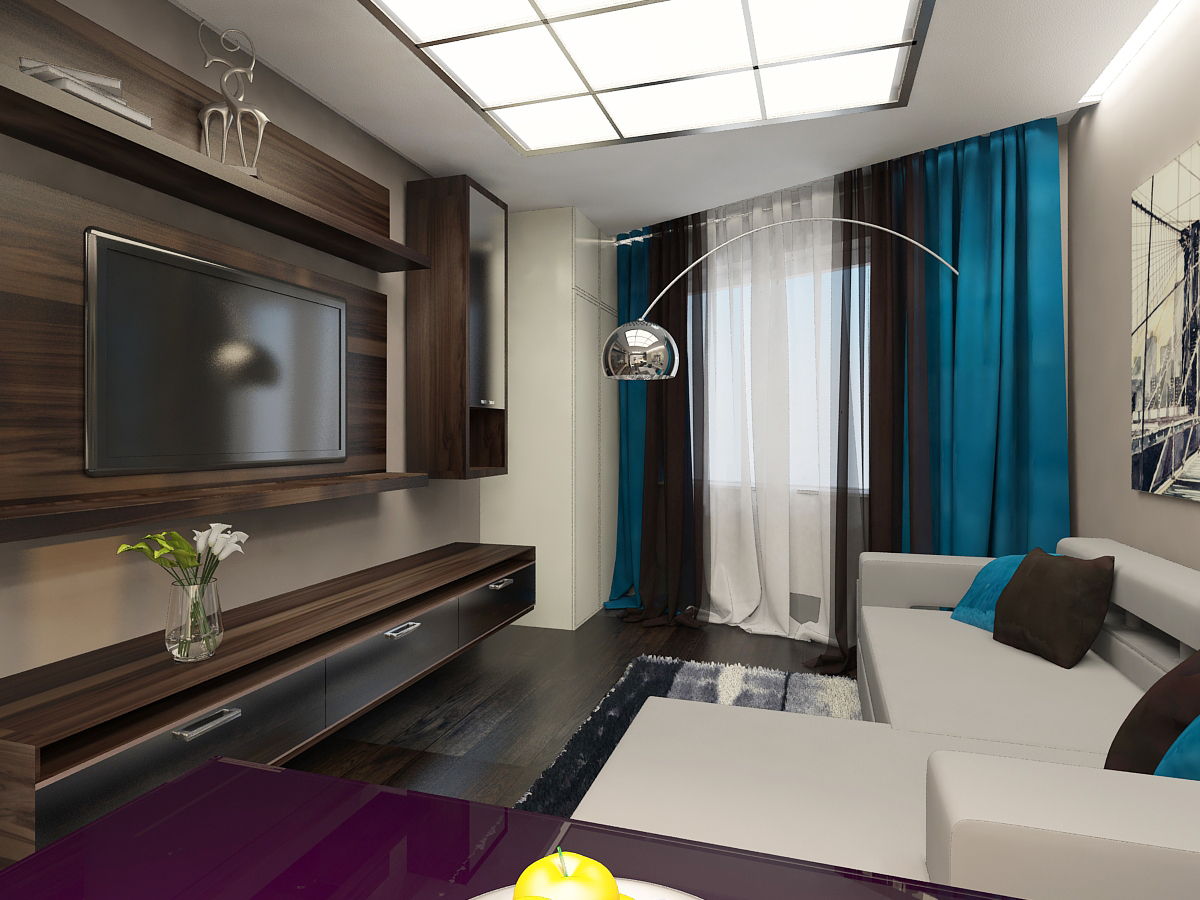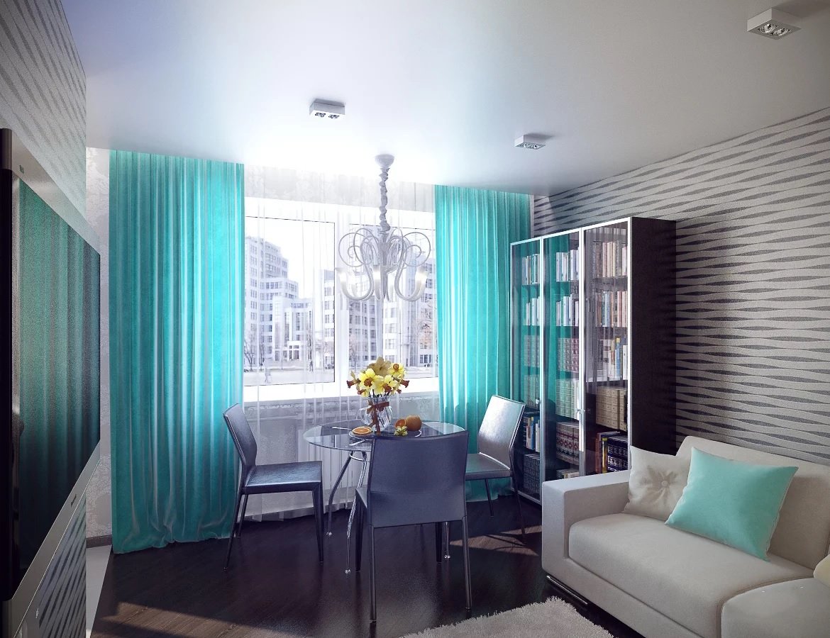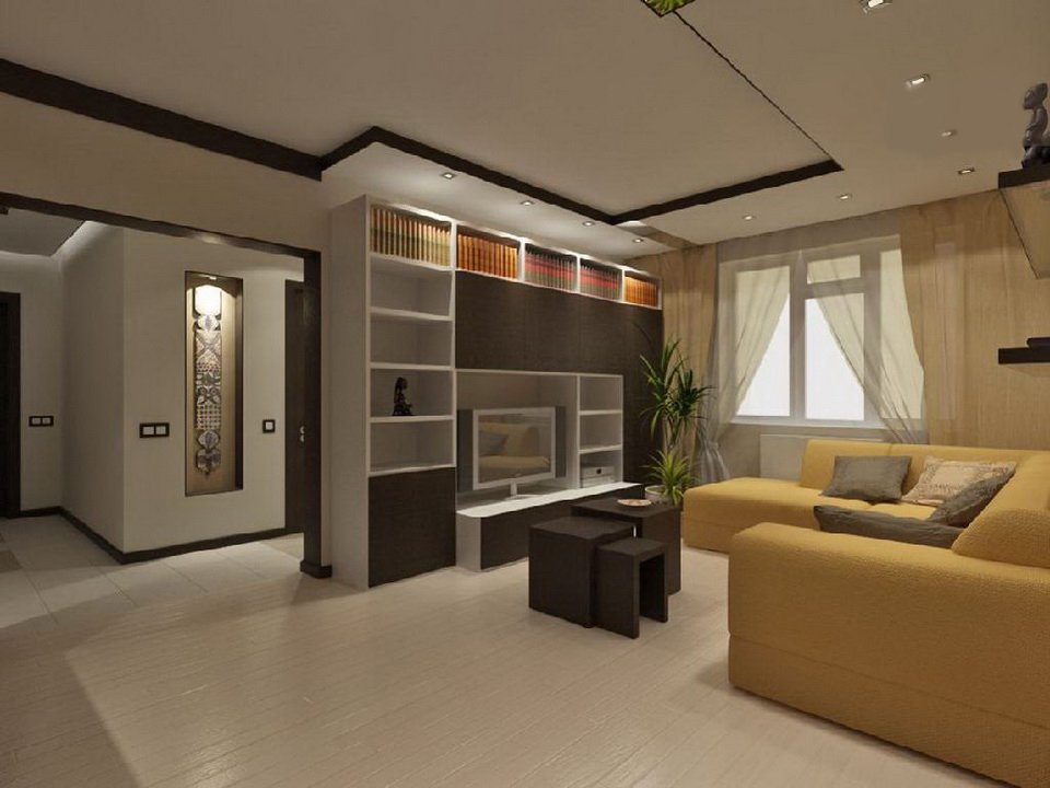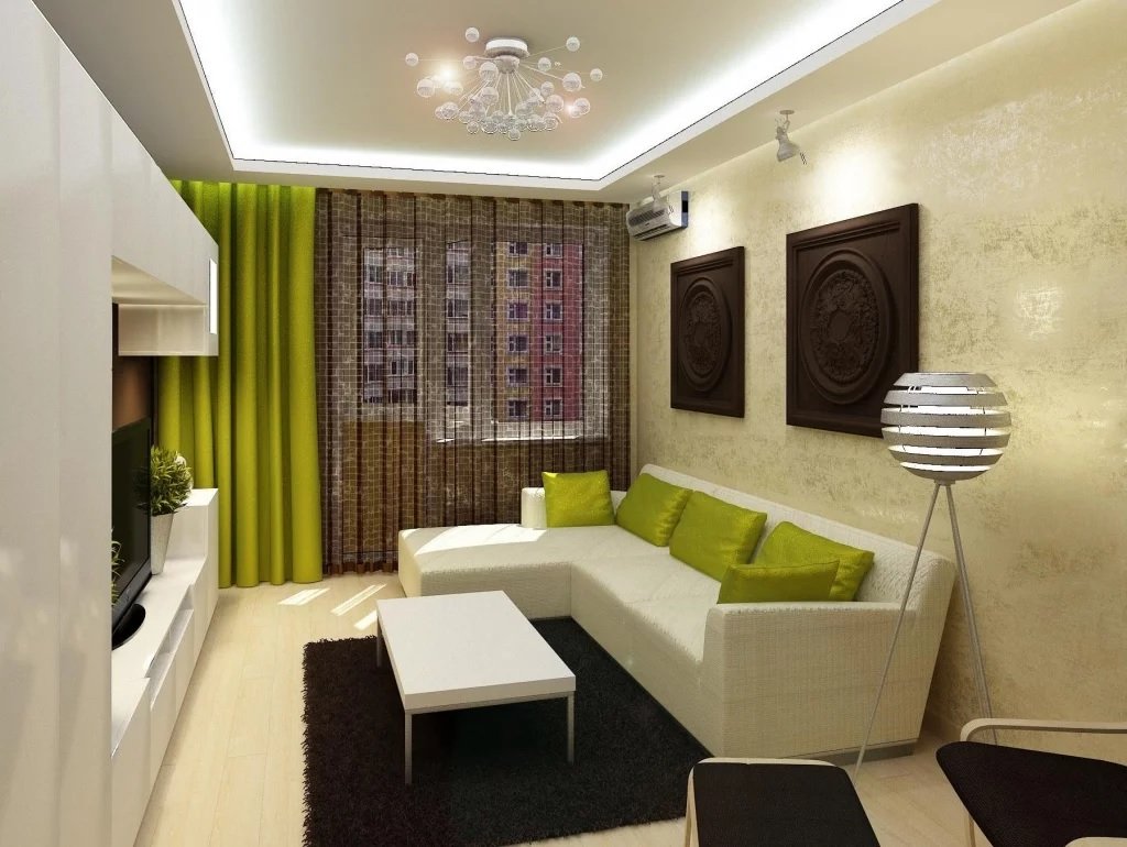 Otro tipo de diseño popular para apartamentos de dos habitaciones es la camiseta. Las ventanas en tales viviendas están orientadas en diferentes direcciones. Las habitaciones recuerdan un poco las mangas de una camisa, conectadas por un "torso" en forma de cocina o corredor. Las familias jóvenes con un niño generalmente comparten espacio, en lugar de combinarlo. En la sala grande, que se utiliza como sala de estar, se coloca una partición. Por lo tanto, resulta una pequeña guardería. Una partición es preferible a una pared de ladrillo o paneles de yeso en habitaciones donde solo hay una ventana. Para no dejar una de las habitaciones sin luz natural, la separación se realiza mejor con muebles o puertas correderas. En otras versiones, la cocina se combina con la sala de estar, a veces añadiéndoles también el pasillo. El último caso es más adecuado para viviendas de "soltero" para una persona. La combinación con la sala de estar se lleva a cabo por aquellas familias a las que les gusta albergar grandes grupos de invitados. Por lo tanto, es realmente más conveniente cocinar la cena y poner la mesa sin distraerse de la conversación.