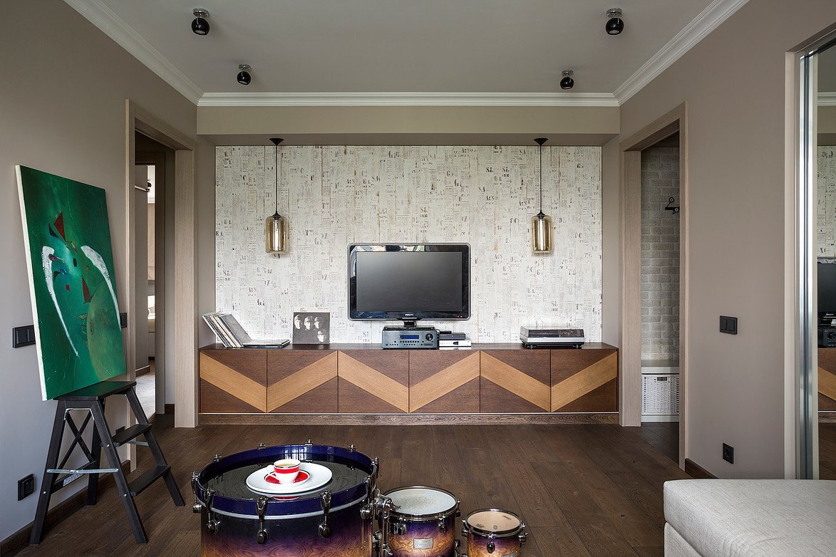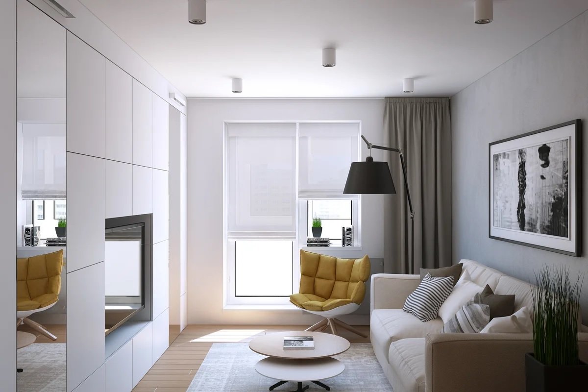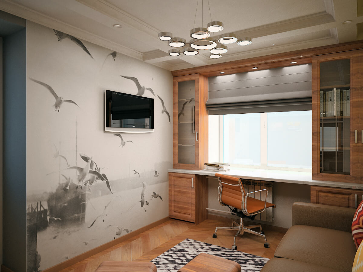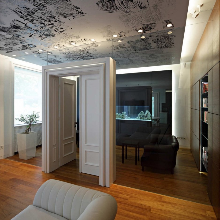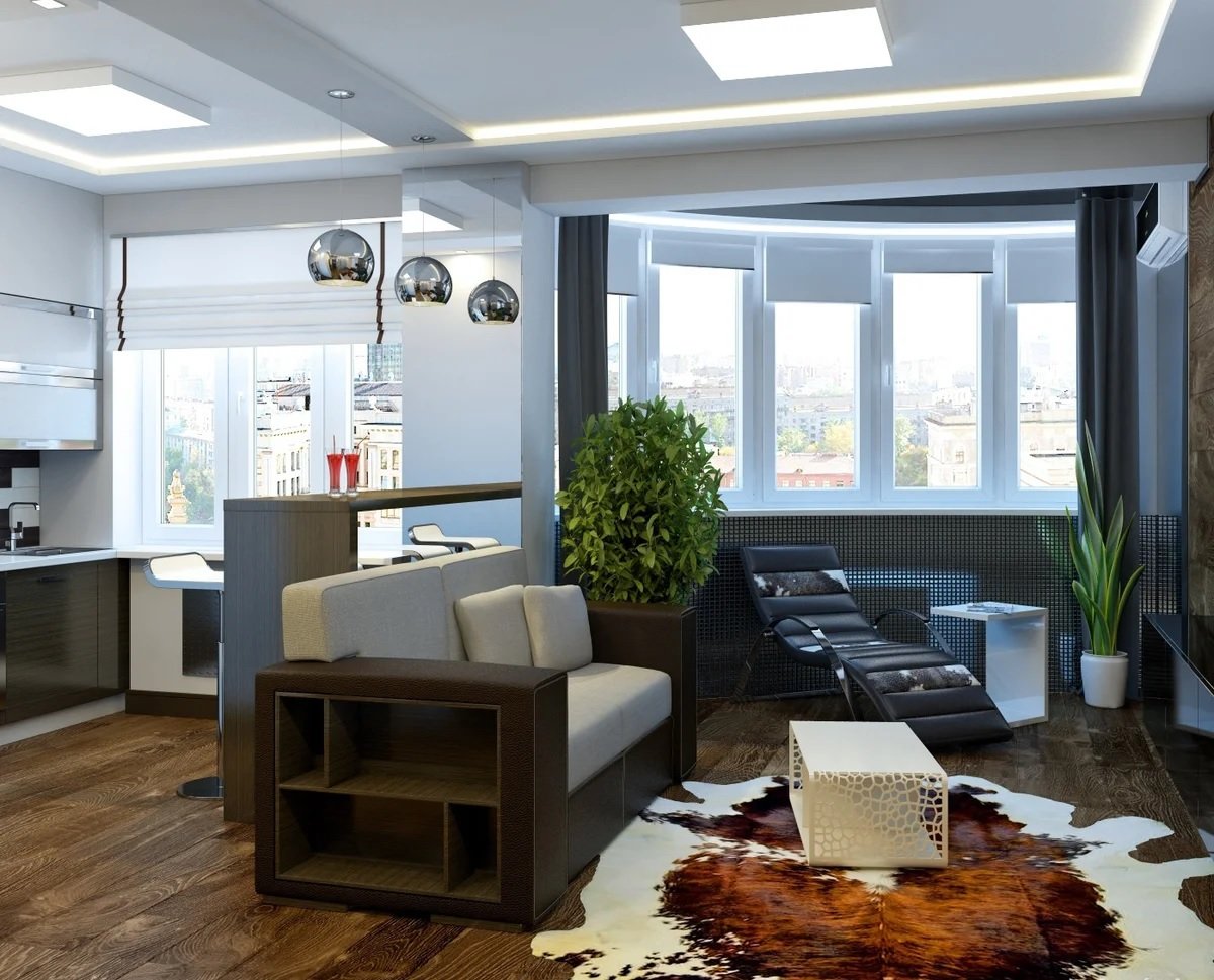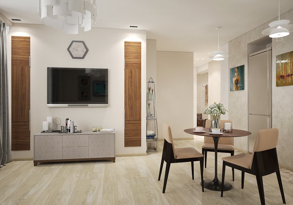 Otro tipo de diseño popular para apartamentos de dos habitaciones es la camiseta. Las ventanas en tales viviendas están orientadas en diferentes direcciones. Las habitaciones recuerdan un poco las mangas de una camisa, conectadas por un "torso" en forma de cocina o corredor. Las familias jóvenes con un niño generalmente comparten espacio, en lugar de combinarlo. En la sala grande, que se utiliza como sala de estar, se coloca una partición. Por lo tanto, resulta una pequeña guardería. Una partición es preferible a una pared de ladrillo o paneles de yeso en habitaciones donde solo hay una ventana. Para no dejar una de las habitaciones sin luz natural, la separación se realiza mejor con muebles o puertas correderas. En otras versiones, la cocina se combina con la sala de estar, a veces añadiéndoles también el pasillo. El último caso es más adecuado para viviendas de "soltero" para una persona. La combinación con la sala de estar se lleva a cabo por aquellas familias a las que les gusta albergar grandes grupos de invitados. Por lo tanto, es realmente más conveniente cocinar la cena y poner la mesa sin distraerse de la conversación.