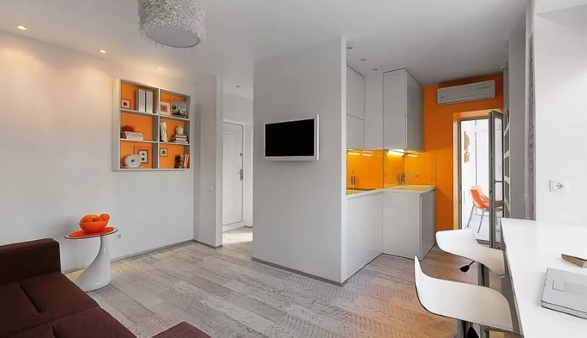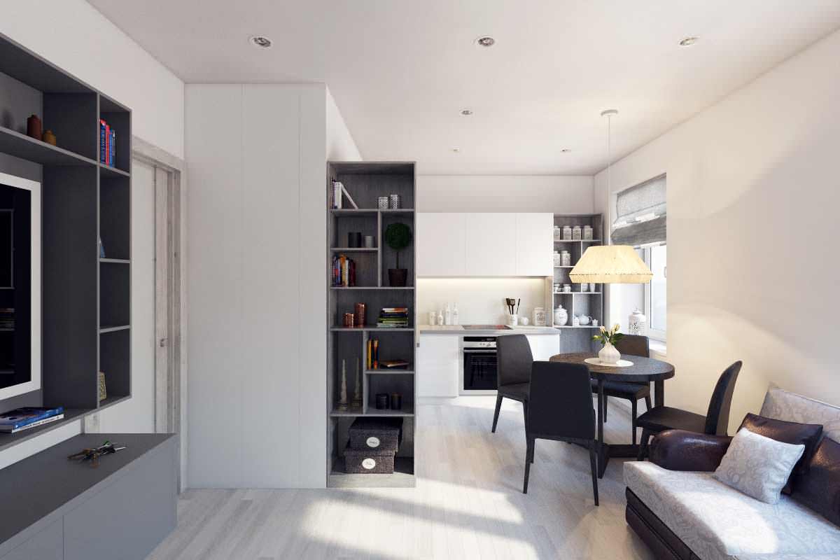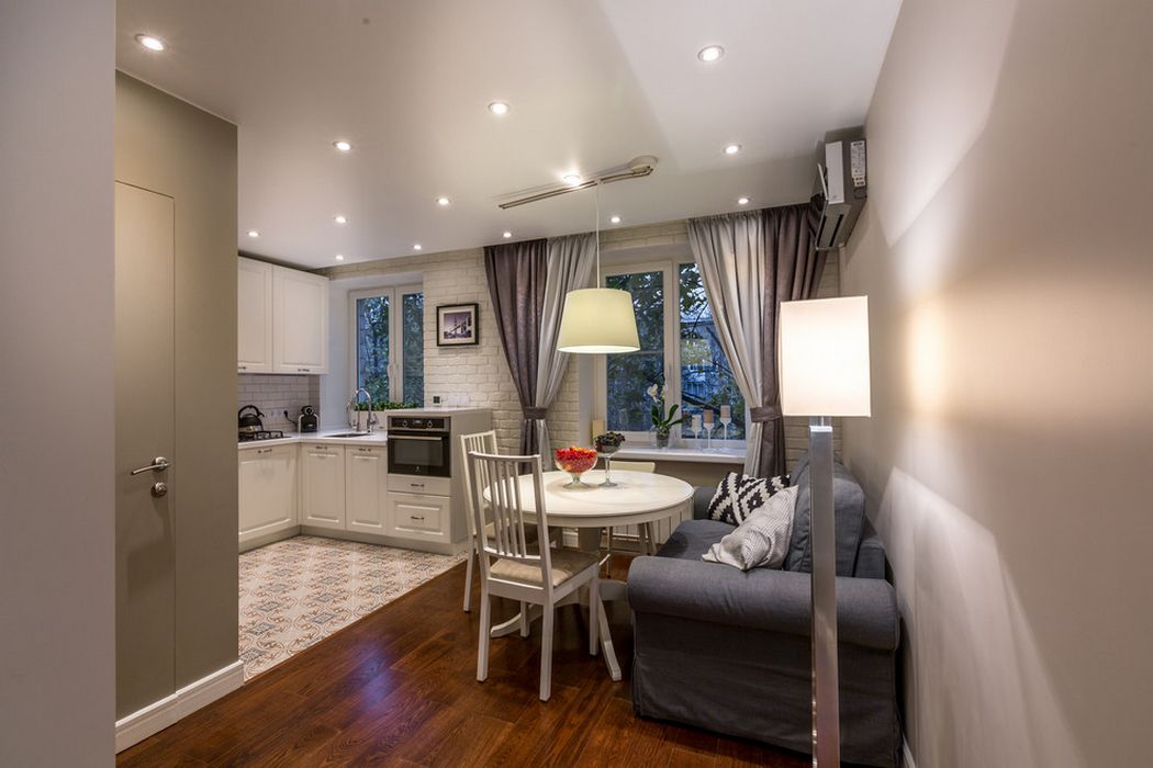 Hay varias opciones para rehacer odnushki en Jruschov. Por lo general, los apartamentos típicos tienen un pequeño hall de entrada, desde el cual se accede a un pasillo con puertas a la cocina, al baño y a una habitación grande que actúa como dormitorio y pasillo. En tales apartamentos hay mucha gente. La vida de una familia joven con un niño se convierte en una prueba severa. En el primer caso, se desmantela la pared que separa la cocina de la habitación. Resulta un pequeño estudio. Ahora su pasillo conduce a dos puertas: al baño y a las habitaciones combinadas. Como cada metro cuenta en apartamentos pequeños, puede ahorrar en muebles voluminosos organizando un vestidor en la antigua sala de estar, al lado del pasillo a través de la pared. En otra realización, la pared entre la cocina y la sala de estar también se retira, sin embargo, el pasillo se une al espacio combinado y no está separado por puertas. Resulta una especie de corredor de forma compleja. Se asigna una pequeña habitación para una litera. La opción se materializa solo en apartamentos de esquina. En dicha vivienda hay una ventana adicional que proporcionará luz natural al dormitorio.
