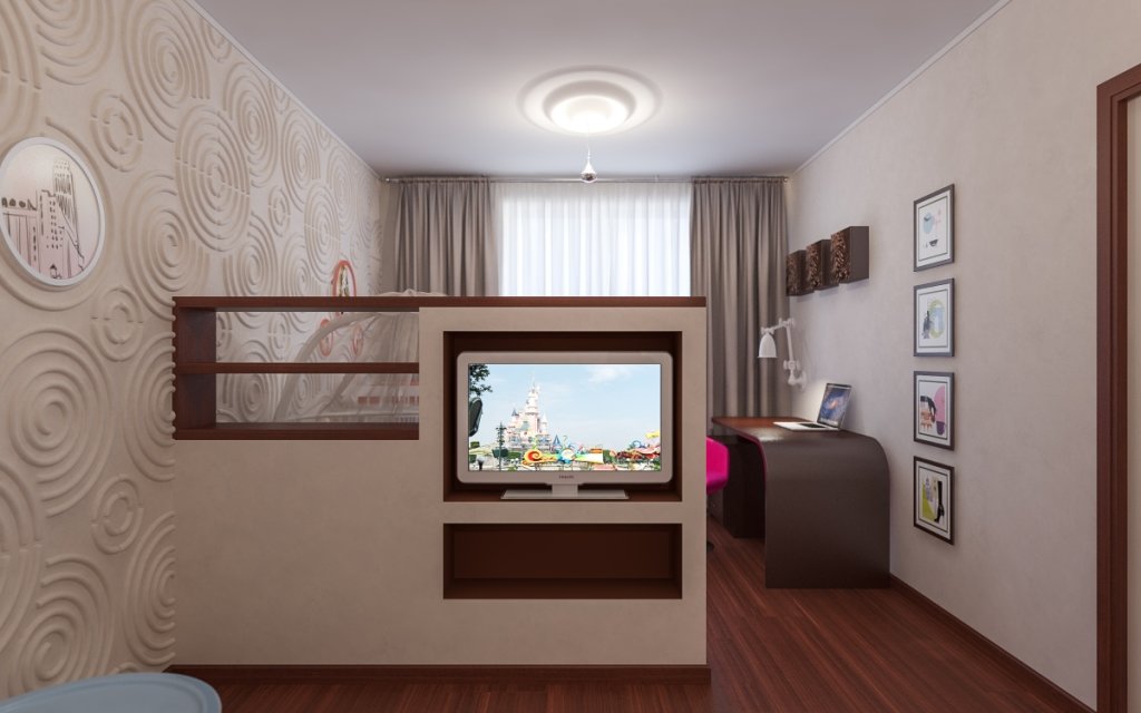 En el cuarto de atrás puedes acomodar al niño, arreglar un armario, escritorio, estanterías para libros. Los niños en edad preescolar tienen suficiente espacio para equipar una pequeña área de juego. Parte de la pared entre la habitación y el corredor se reemplaza mejor con puertas correderas.Se puede ubicar una cama para adultos en el pasillo. También es posible combinar parte de la habitación con el pasillo.