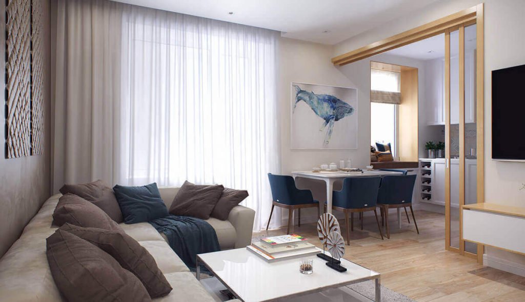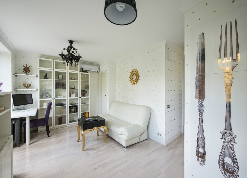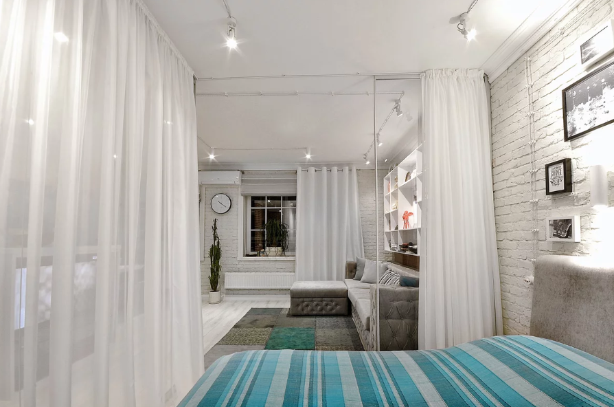 Diferenciar el espacio en una habitación espaciosa debido a la decoración de las paredes y la disposición adecuada de los muebles. El área de cocción está separada por una pantalla, una barra, una pequeña elevación en la cocina. Puede esconder una cama en un apartamento tipo estudio con cortinas con dosel o tabiques móviles.