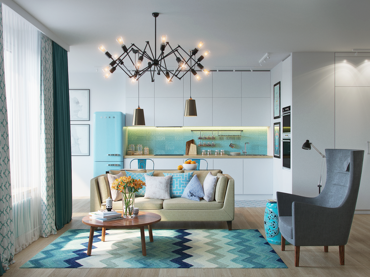 El uso clásico del esquema de color es un acabado monocromático en colores brillantes. Para que la habitación no parezca aburrida, puede tomar un color básico, el segundo es amortiguado y el tercero contrastante. En las profundidades de la habitación colocamos colores brillantes, paredes, pisos, cortinas, hacemos grandes muebles con luz. La combinación de varios colores brillantes se verá intrusiva y ridícula.