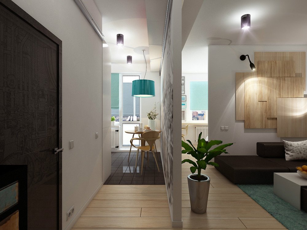 La principal ventaja de este diseño es el aislamiento completo de la habitación y la cocina. Contras: pasillos estrechos, falta de espacio para crear muchos interiores elegantes, falta de capacidad para amueblar el espacio con muebles de acuerdo con el esquema planificado.