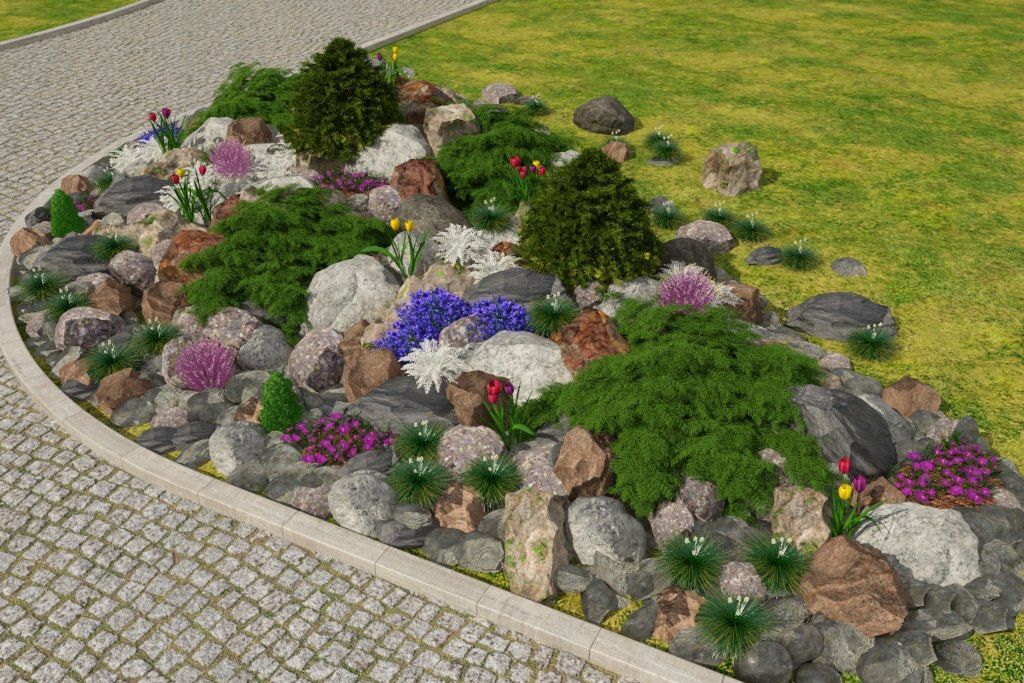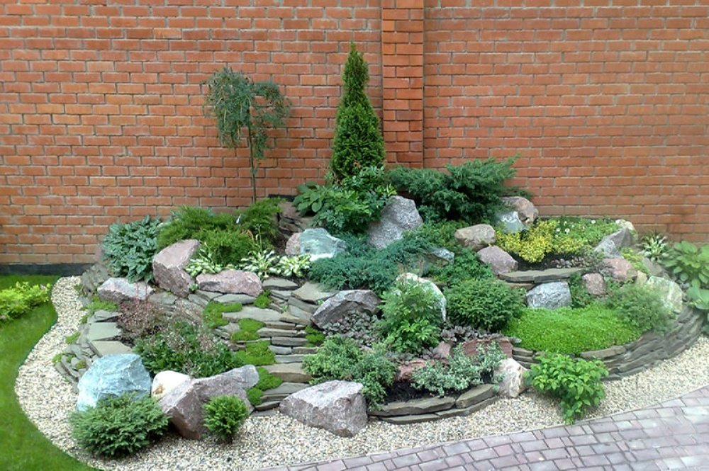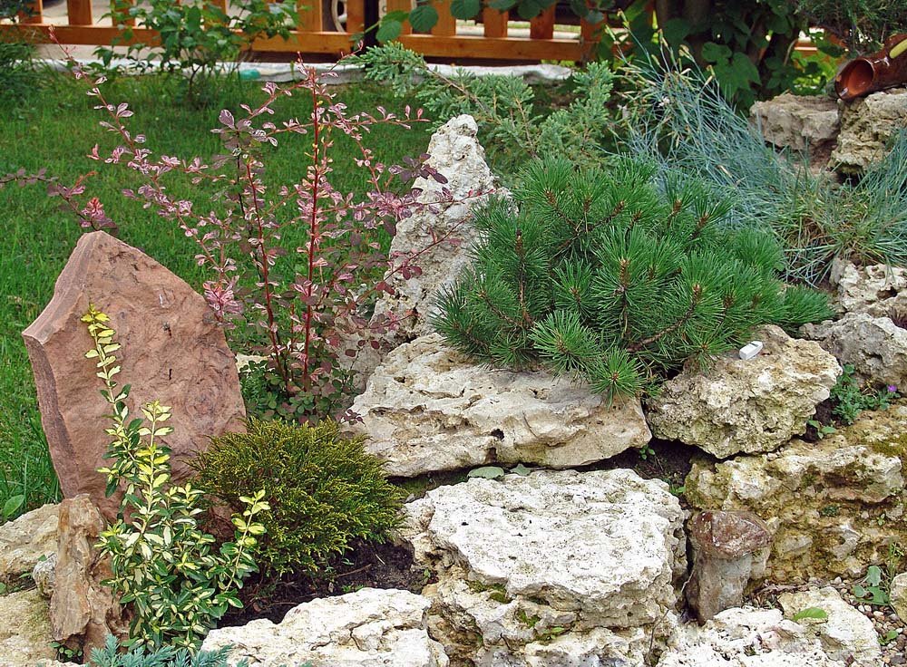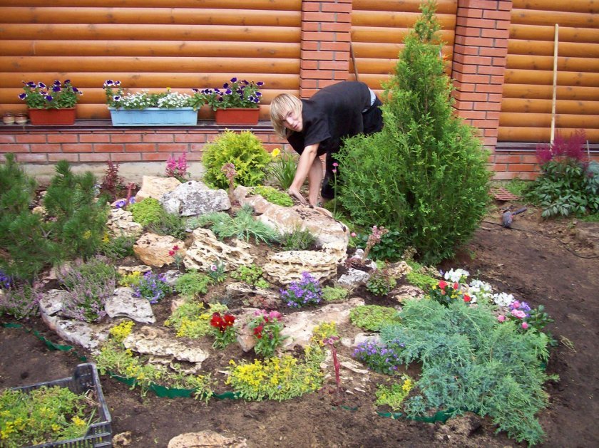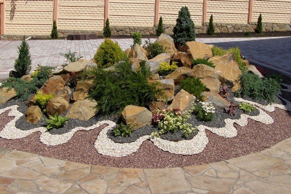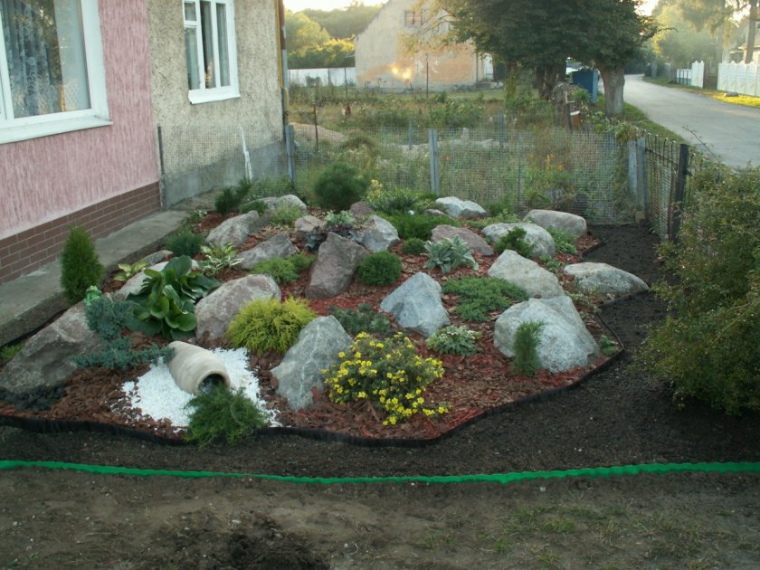 Los jardines de rocas comienzan a plantarse con arbustos, coníferas y plantas altas que se ven espectaculares al pie de grandes piedras.Los nichos para las plántulas amantes del calor están aislados con una pequeña arcilla expandida.