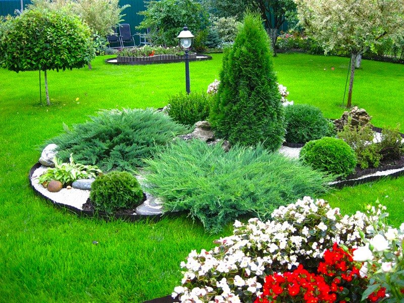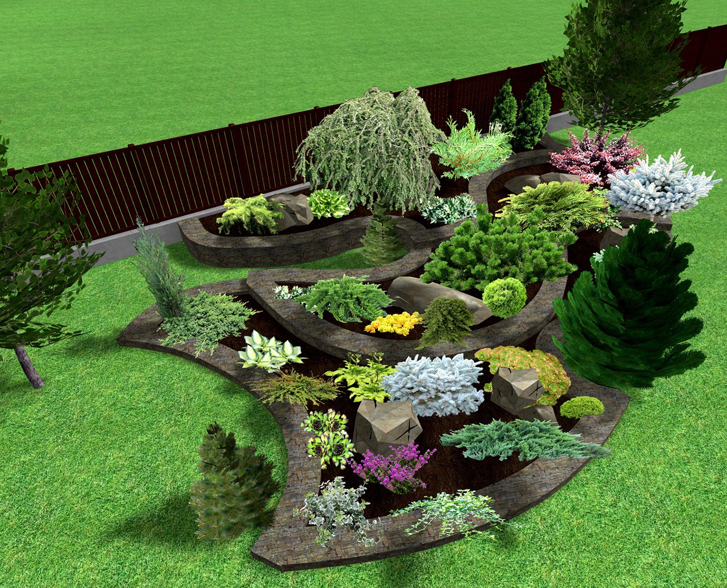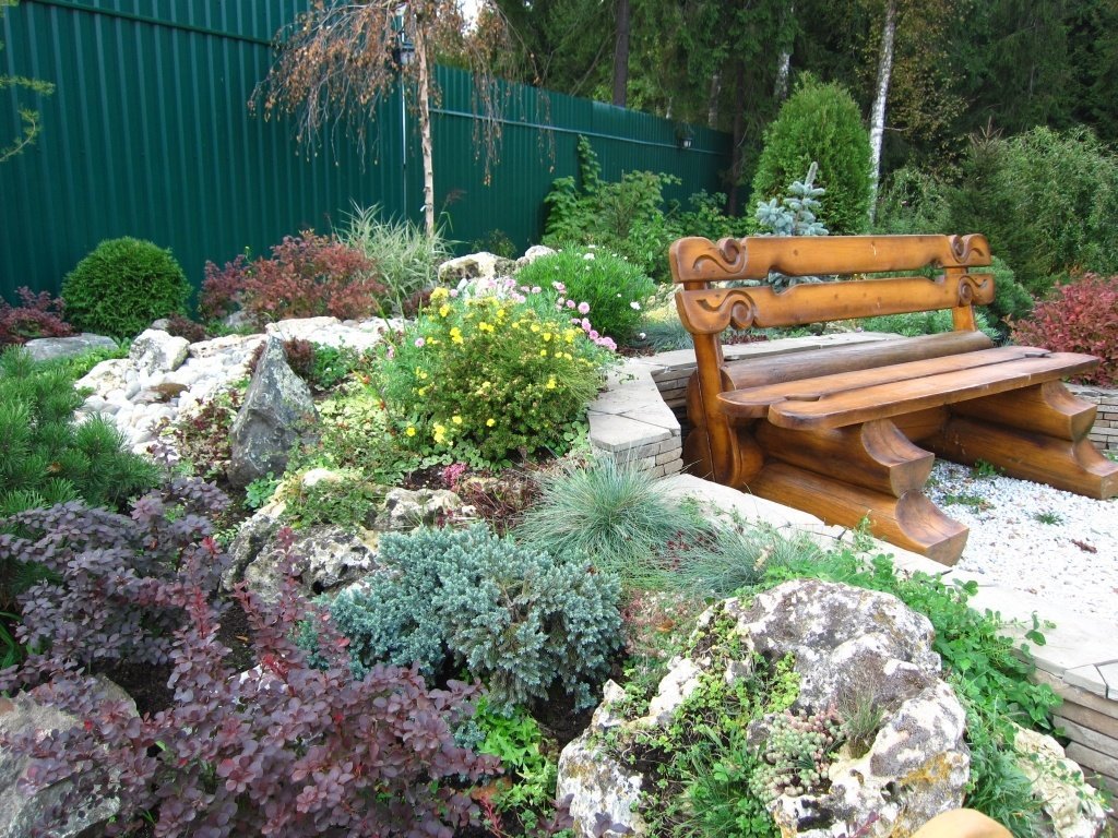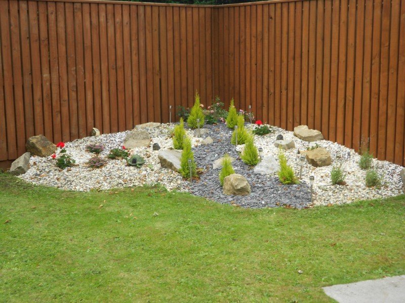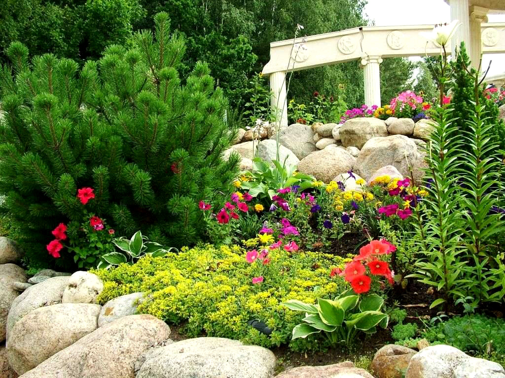 Los jardines de rocas comienzan a plantarse con arbustos, coníferas y plantas altas que se ven espectaculares al pie de grandes piedras.Los nichos para las plántulas amantes del calor están aislados con una pequeña arcilla expandida.