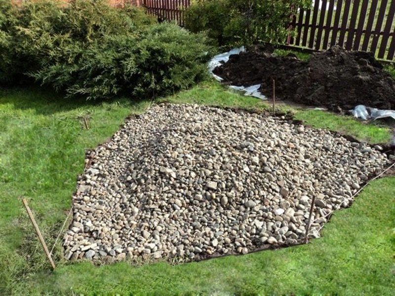 Una mezcla de tierra fértil, astillas de madera, humus, grava fina se coloca y compacta en el drenaje preparado.