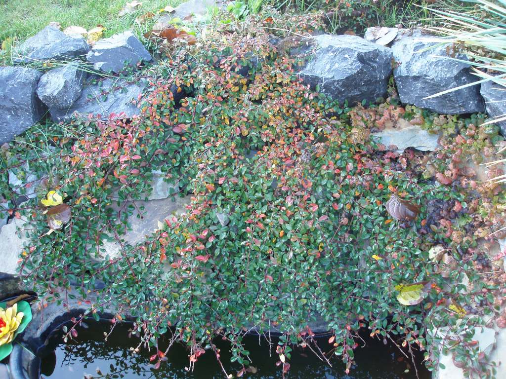 arbustos de cotoneaster con pequeñas inflorescencias blancas, las frutas rojas sobreviven bien en montículos artificiales;