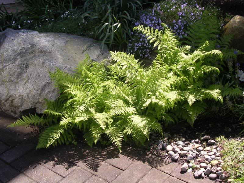 Los helechos con amplias hojas de plumas plantadas cerca del arroyo crean un efecto de vida silvestre.