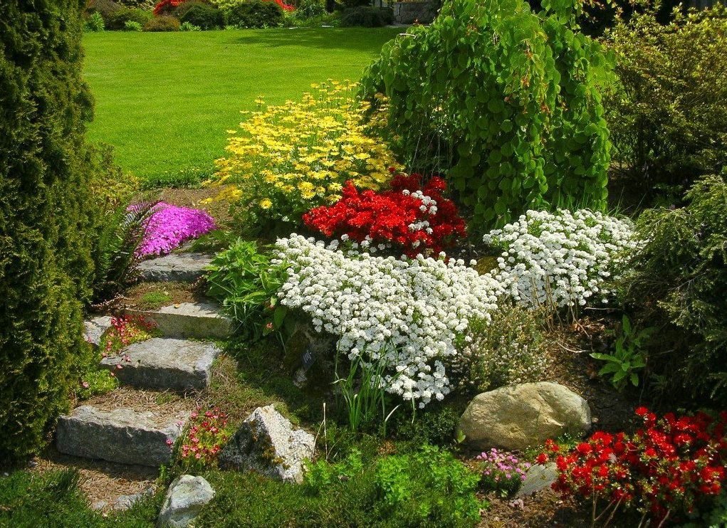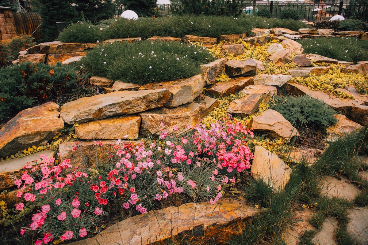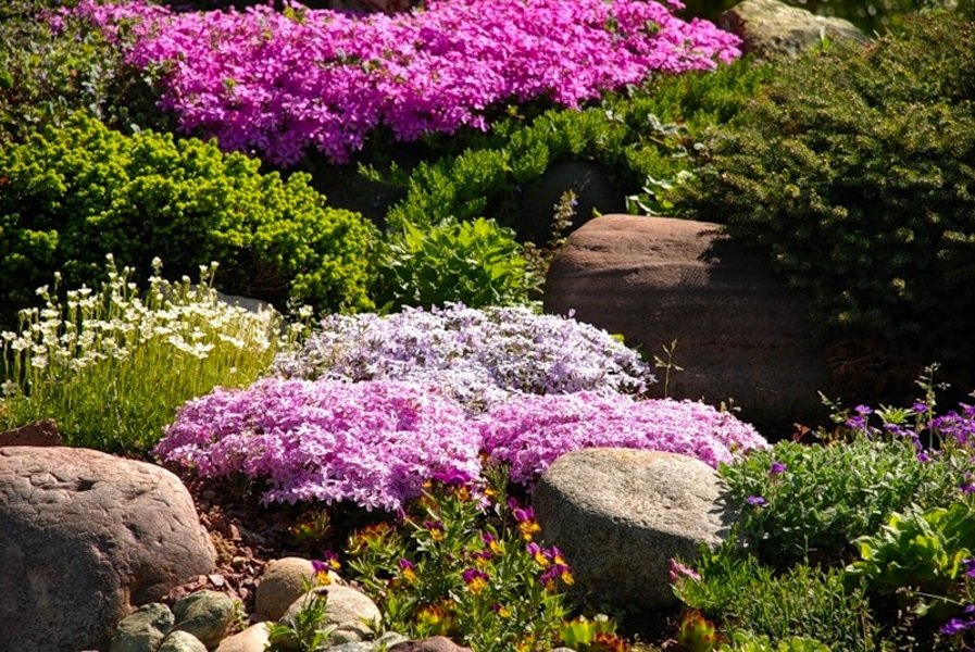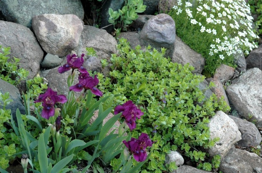 La colina alpina es un montículo de tierra con piedras de varias formas colocadas en niveles, entre los cuales crecen arbustos y flores de tamaño insuficiente. Un relieve creado artificialmente imita elementos inherentes a un área montañosa: una meseta, pendientes, acantilados. Para reproducir una copia del paisaje alpino, se planta un macizo de flores de piedra con plantas de montaña. Tal extremo botánico no está adaptado a las condiciones locales, por lo que a menudo se reemplaza por tulipanes locales, azafranes, arándanos rojos, bígaro. La rocalla difiere del jardín de rocas con una superficie plana, una gran cantidad de piedras. El sitio de grava rocosa se forma en un área plana, se puede ubicar en un área de varias decenas de metros. Externamente, la rocalla está cerca del paisaje de la franja central, plantada con estepa y vegetación forestal.
