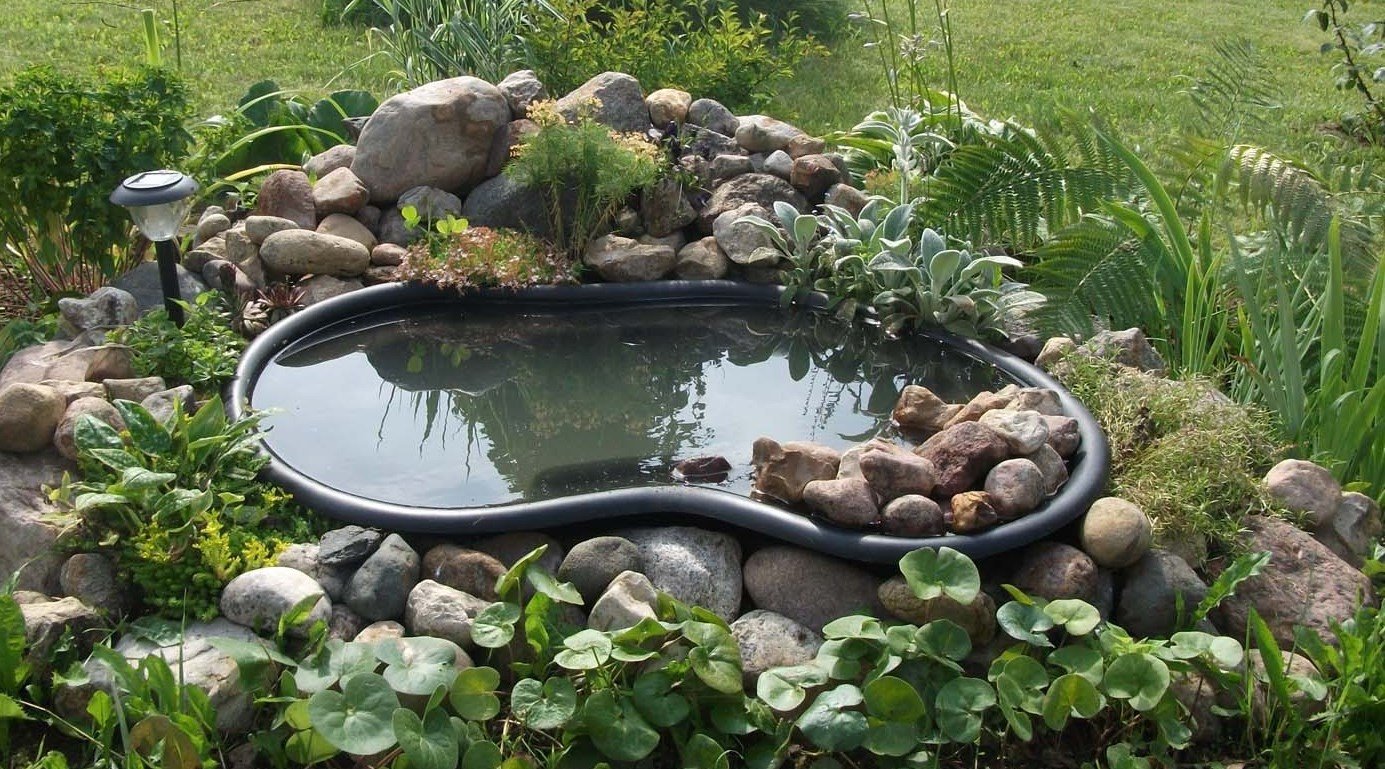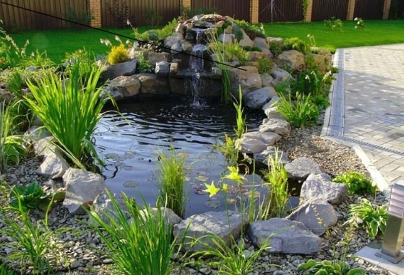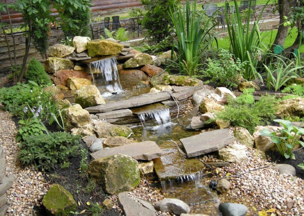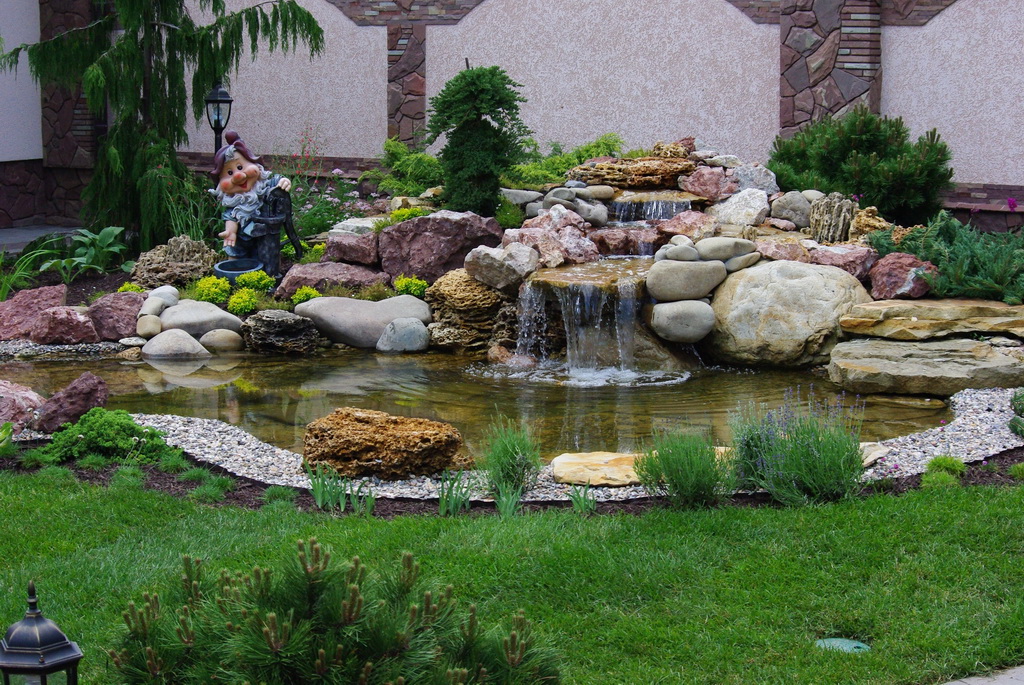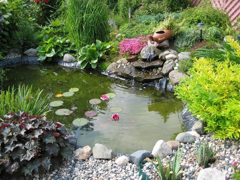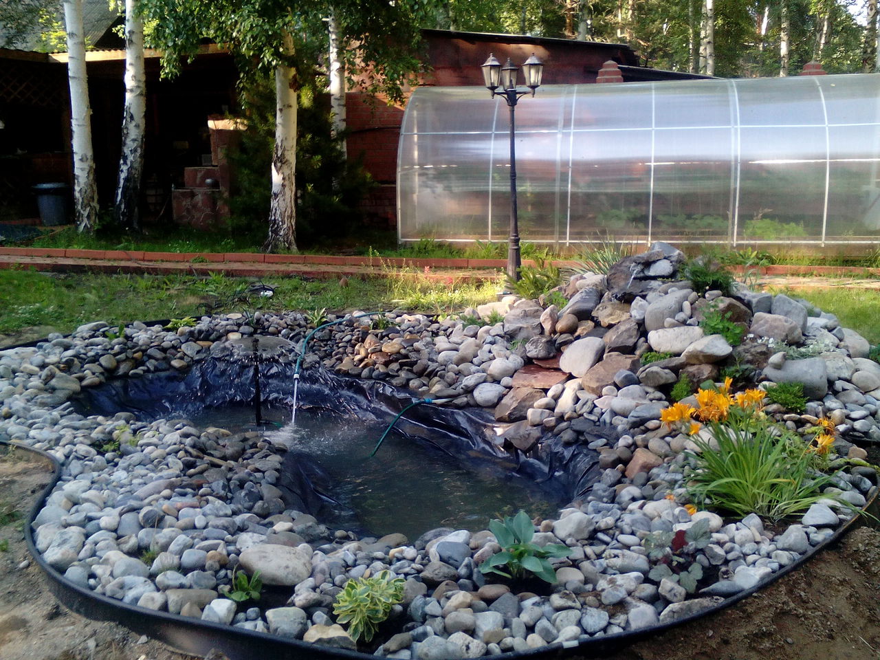 Se arranca un pozo para un estanque, las paredes están aisladas con película de caucho butílico. Se puede hacer un pequeño estanque con una llanta de automóvil o un revestimiento especial de fibra de vidrio, que se coloca en un pozo que repite los lados de los lados. Para una corriente que fluye a lo largo de un canal de piedra, se monta una bomba en un estanque, conectada a una manguera de suministro de agua. Para la cascada, tome piedras planas, sujete con espuma de montaje, cubra las costuras con pequeños fragmentos. Decora el jardín de rocas, crea una pequeña fuente genial. Para facilitar el trabajo, compre una bomba con un filtro incorporado. La unidad se instala en un contenedor, lleno de agua, se enciende de acuerdo con las instrucciones. Para crear una fuente sin bomba, la tubería de agua se conduce a un estanque. Se puede llevar agua al jardín para riego.