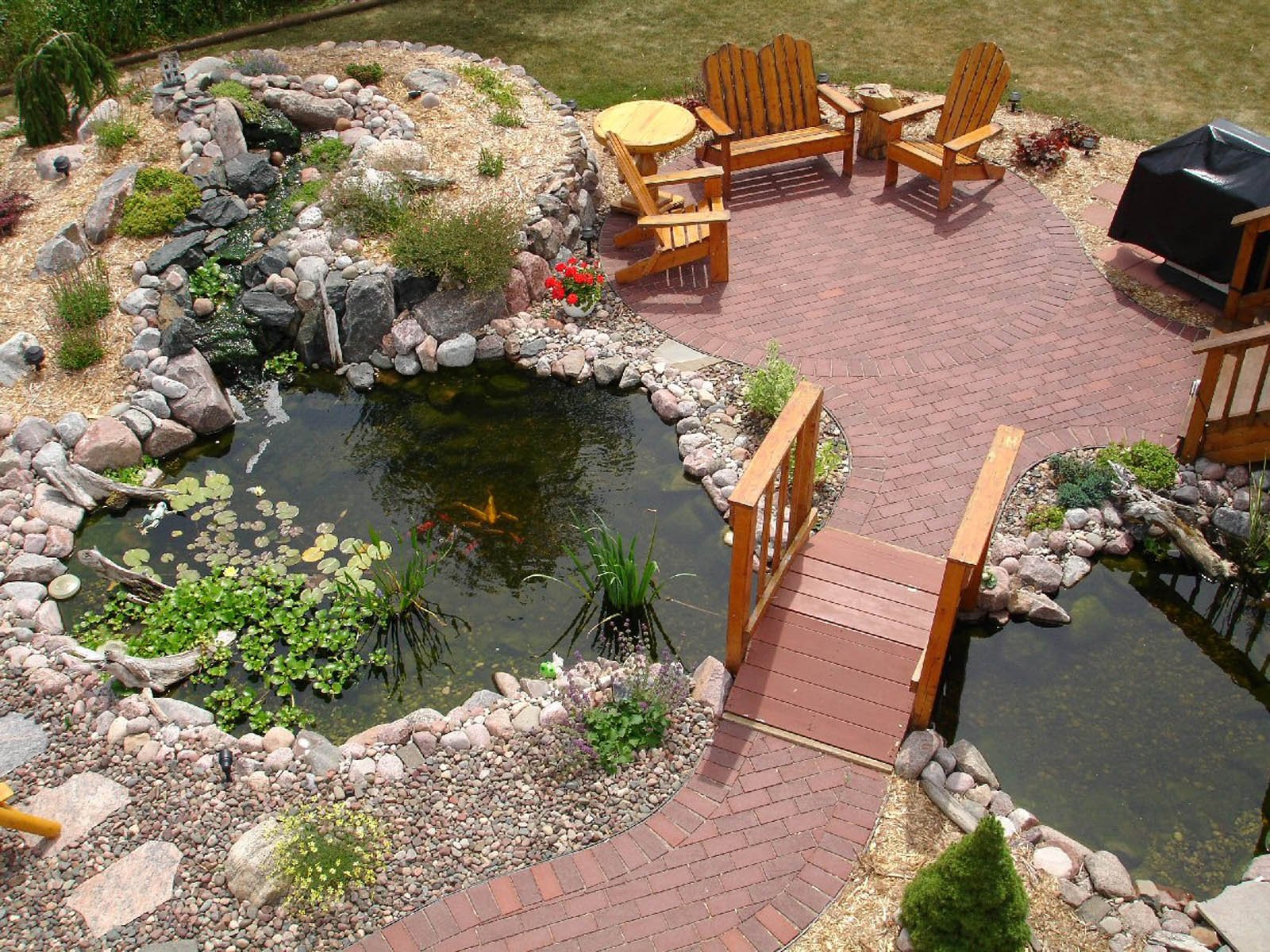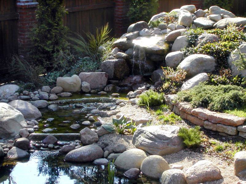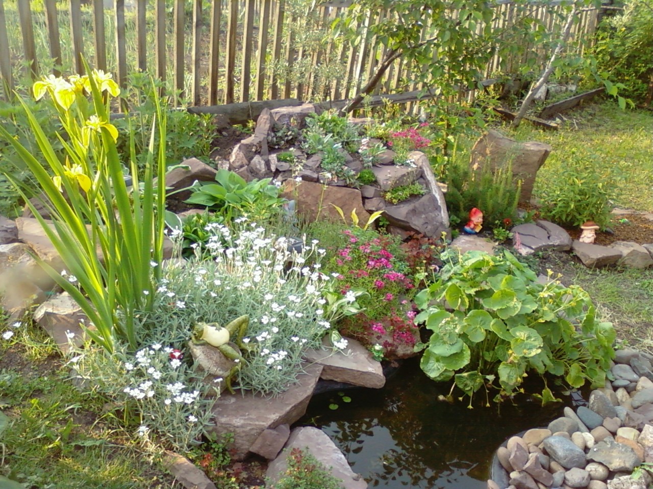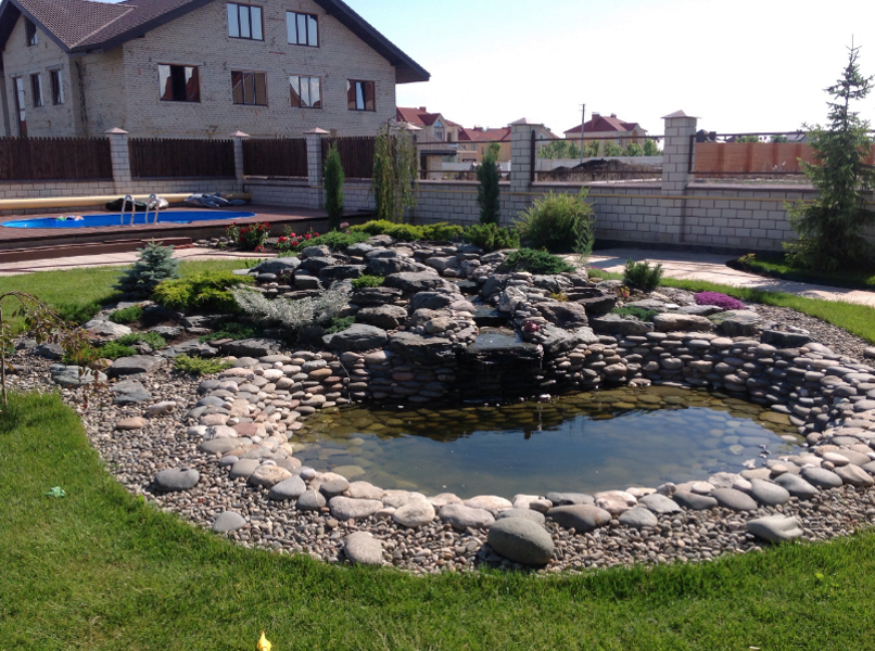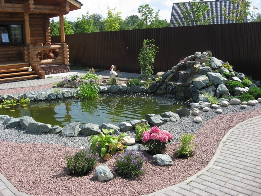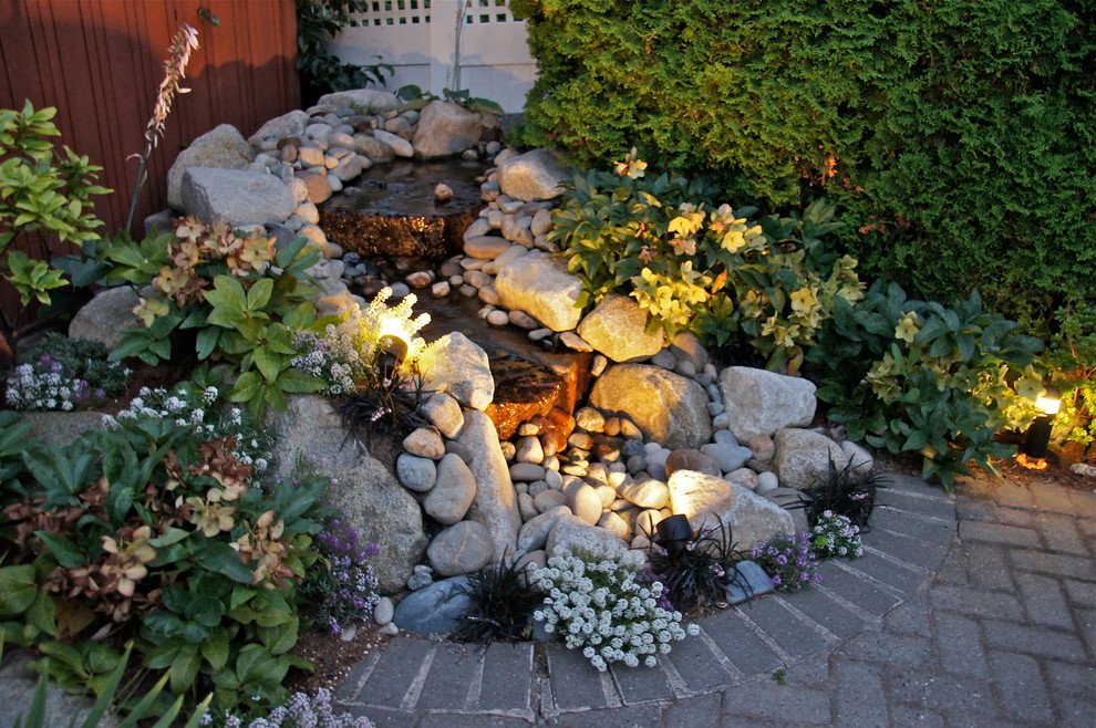 Se arranca un pozo para un estanque, las paredes están aisladas con película de caucho butílico. Se puede hacer un pequeño estanque con una llanta de automóvil o un revestimiento especial de fibra de vidrio, que se coloca en un pozo que repite los lados de los lados. Para una corriente que fluye a lo largo de un canal de piedra, se monta una bomba en un estanque, conectada a una manguera de suministro de agua. Para la cascada, tome piedras planas, sujete con espuma de montaje, cubra las costuras con pequeños fragmentos. Decora el jardín de rocas, crea una pequeña fuente genial. Para facilitar el trabajo, compre una bomba con un filtro incorporado. La unidad se instala en un contenedor, lleno de agua, se enciende de acuerdo con las instrucciones. Para crear una fuente sin bomba, la tubería de agua se conduce a un estanque. Se puede llevar agua al jardín para riego.