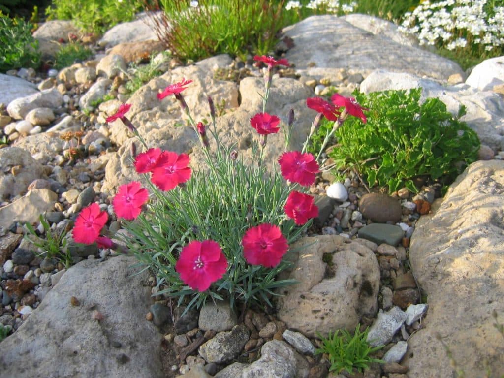 Se eligen flores sin pretensiones para el jardín de rocas: coneflower, clavo alpino, alissum rocoso, juvenil, cola de liebre. Es difícil cuidar las caprichosas edelweiss, las campanas rocosas.