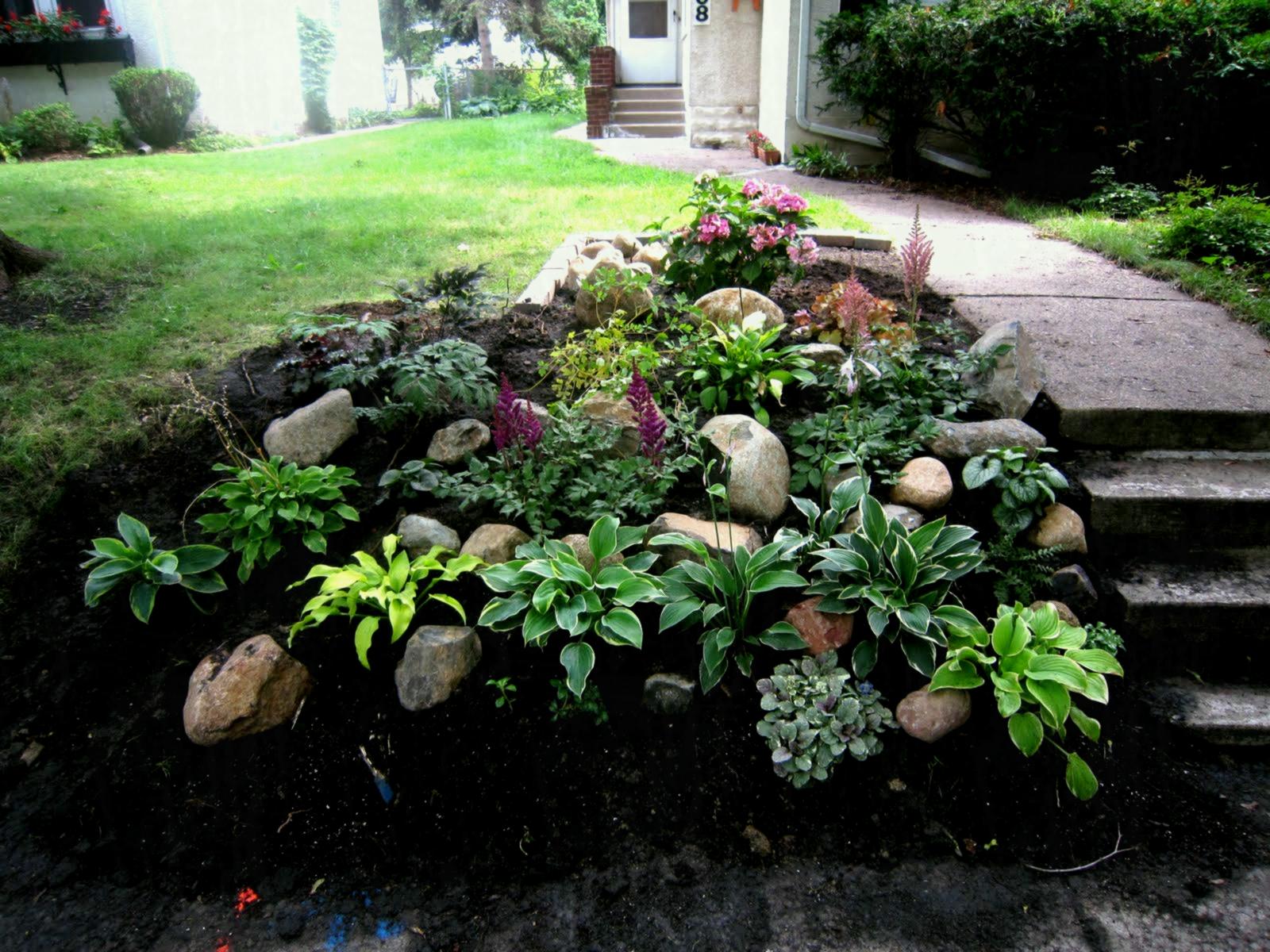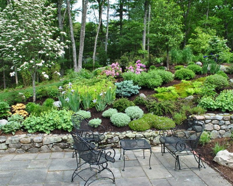 El jardín está roto en una superficie inclinada o plana, use un mínimo de piedras.