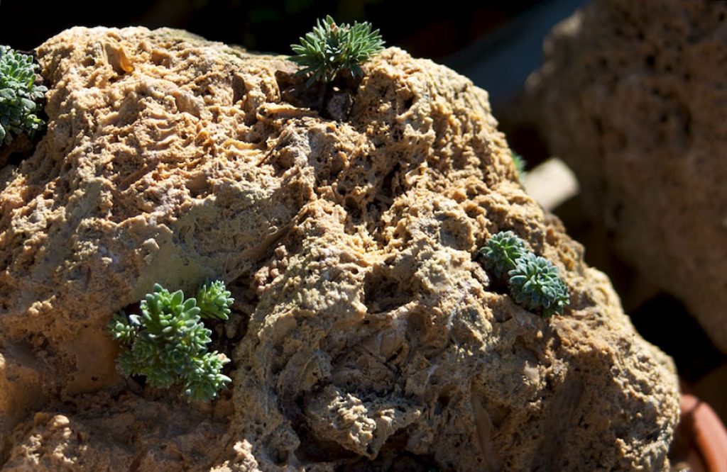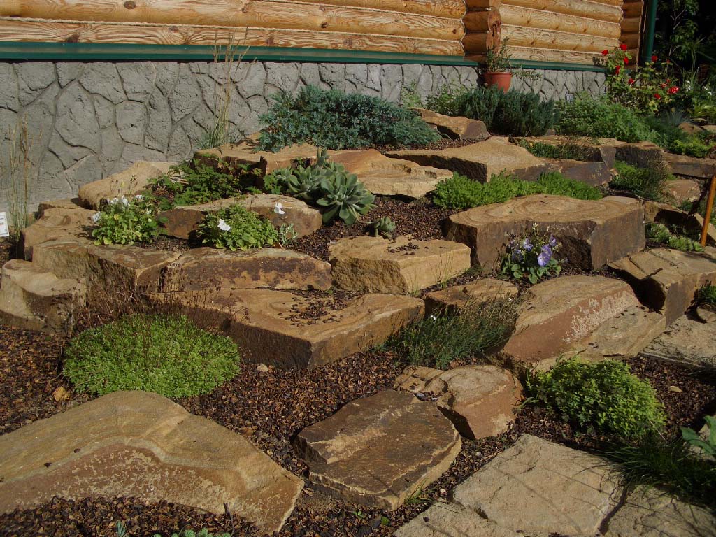 Arenisca: los bloques con una estructura de grano grueso se utilizan no solo para la decoración de una colina alpina, sino también para plantar arbustos con raíces pequeñas.