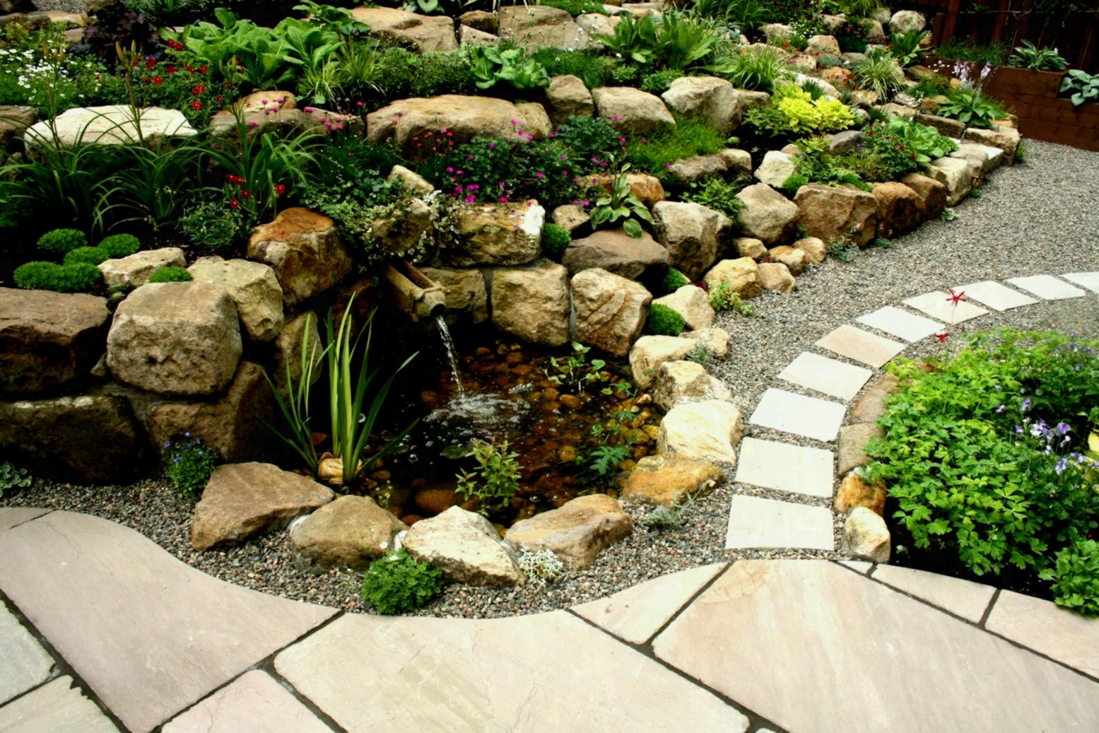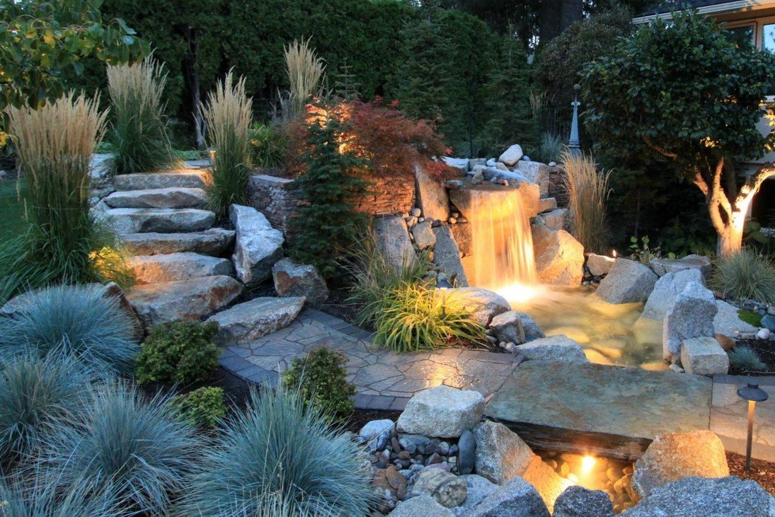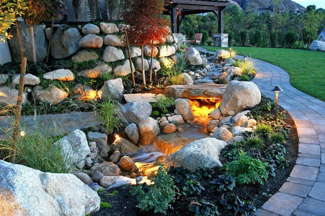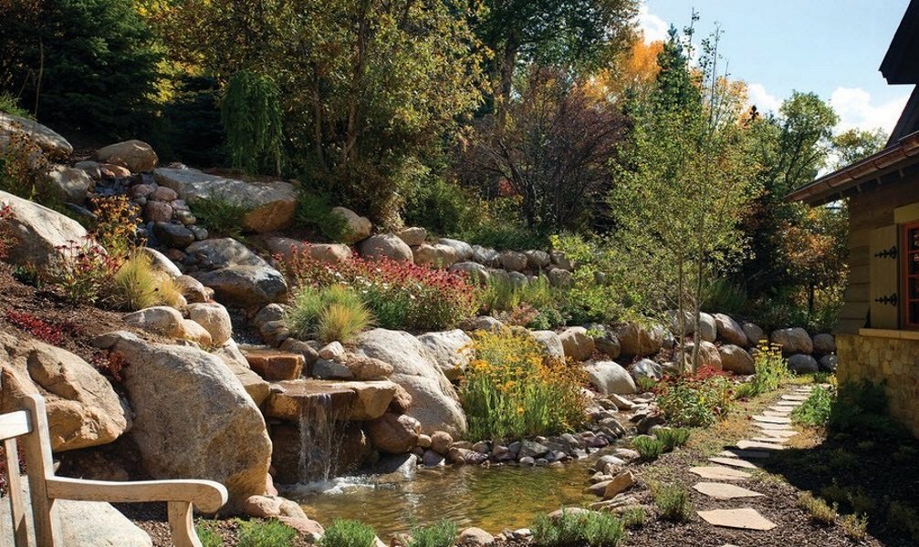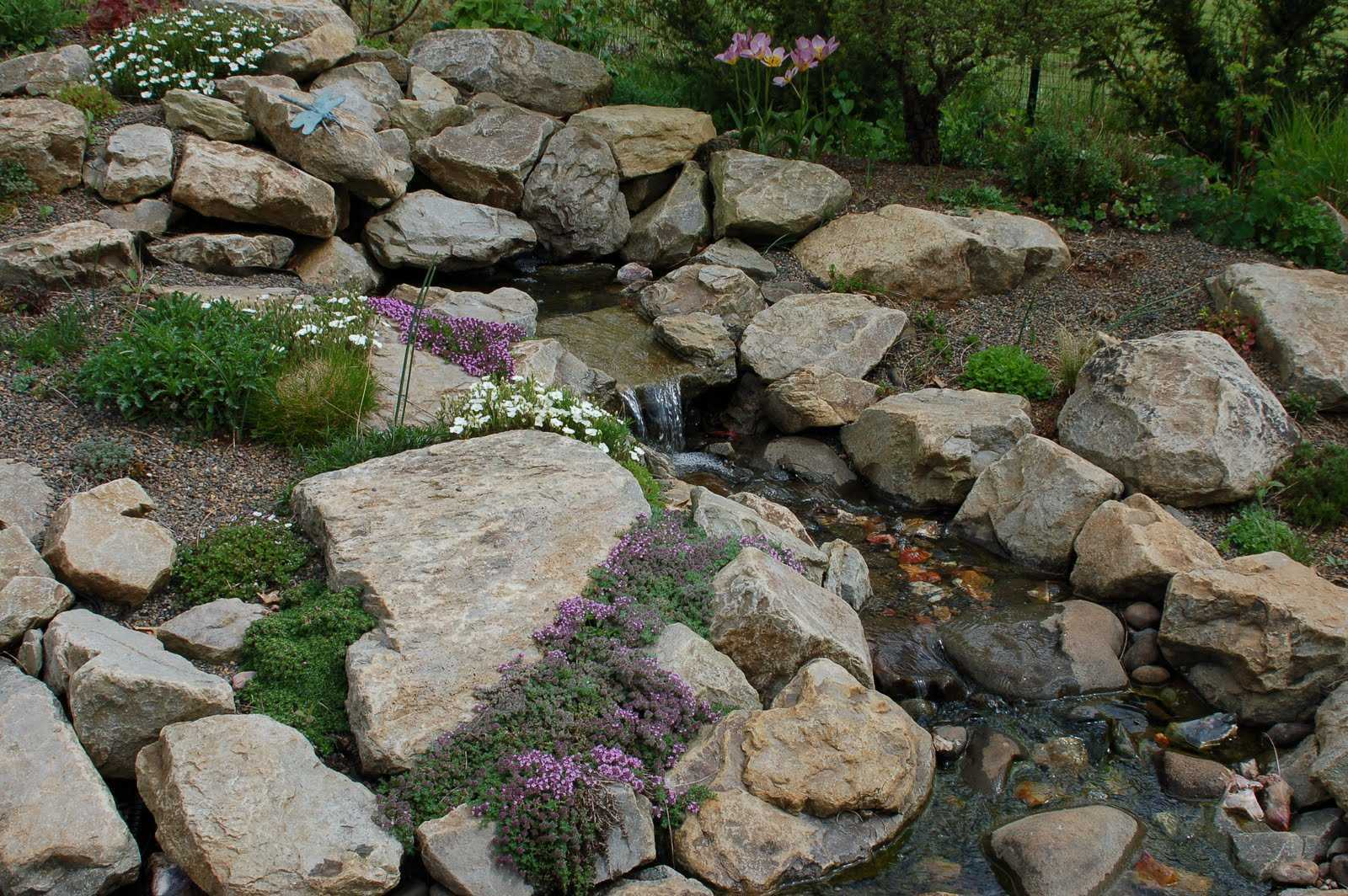 La decoración con materiales naturales, estanques artificiales, luces, le dan al jardín de rocas un lugar único. El paisaje de montaña se complementa con arroyos secos. Con la disposición adecuada, parece que una corriente de agua ha fluido recientemente a lo largo de un cauce seco. La fuente del arroyo debe salir de debajo de un bloque grande, la boca está oculta en espacios verdes, hojas grandes. La superficie del agua es imitada por guijarros, grava fina.